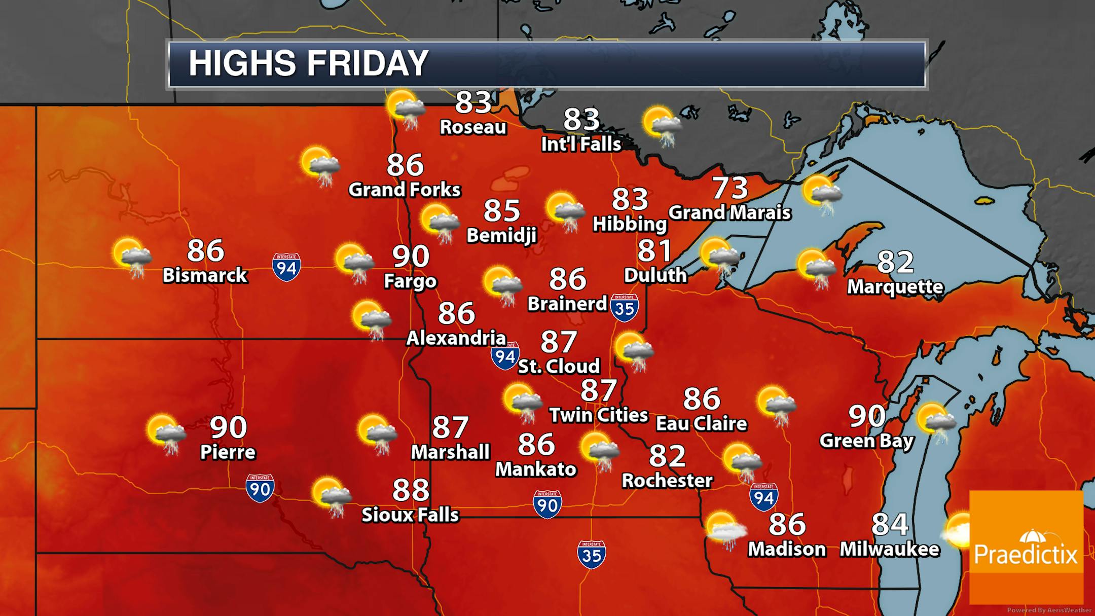 As we head into Friday, we will watch an isolated shower or storm chances throughout the day, mainly in northern and far southern Minnesota. A better chance of storms on Friday will be into the evening and overnight hours as a cold front moves into the state. Highs on Friday will generally be in the 80s statewide with 70s along the North Shore.