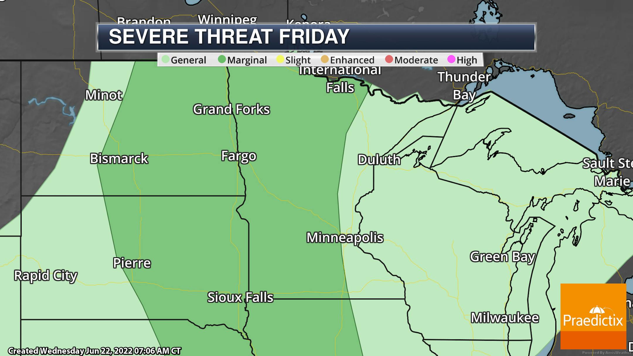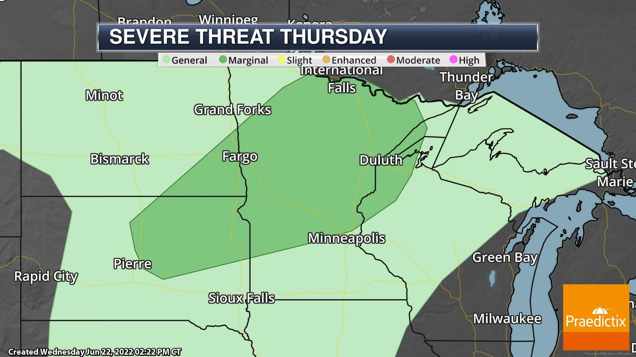 Due to the threat of mainly large hail and damaging winds with these storms late Thursday into Thursday Night, a Marginal Risk (threat level 1 of 5) is in place across central and northern Minnesota.