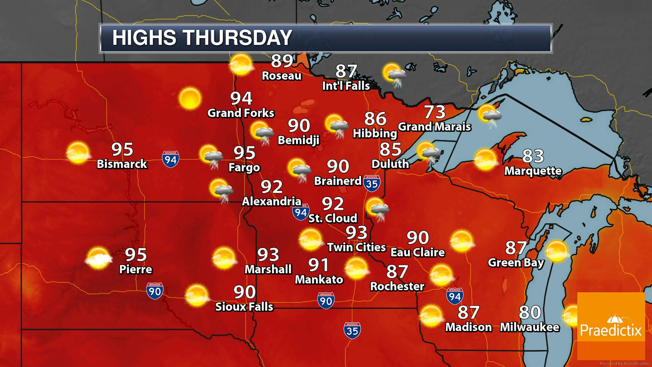 So we will watch the potential of a few storms late in the day into the overnight hours on Thursday across Minnesota. Otherwise, much of the morning into early/mid-afternoon should be quiet with mainly sunny skies and just a few passing clouds. Highs will be 10-15 degrees above average across much of the state, climbing in the 80s and 90s.