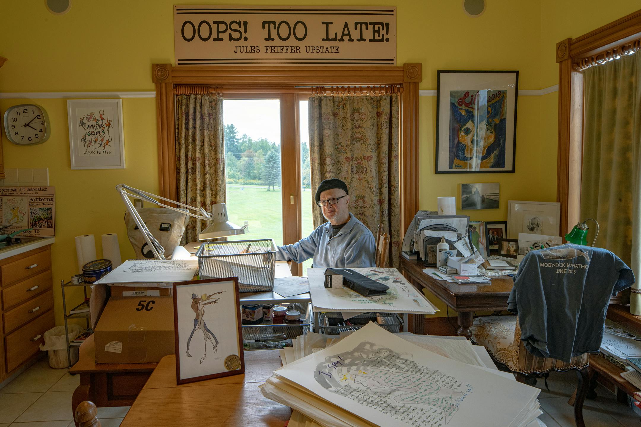 In Feiffer’s studio, there’s space not just for necessities, such as his drawing table, but also such conveniences as a refrigerator, sink and stove.