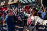 Armed with two dozen red balloons, the group marched down Lake Street singing songs in English and Spanish.