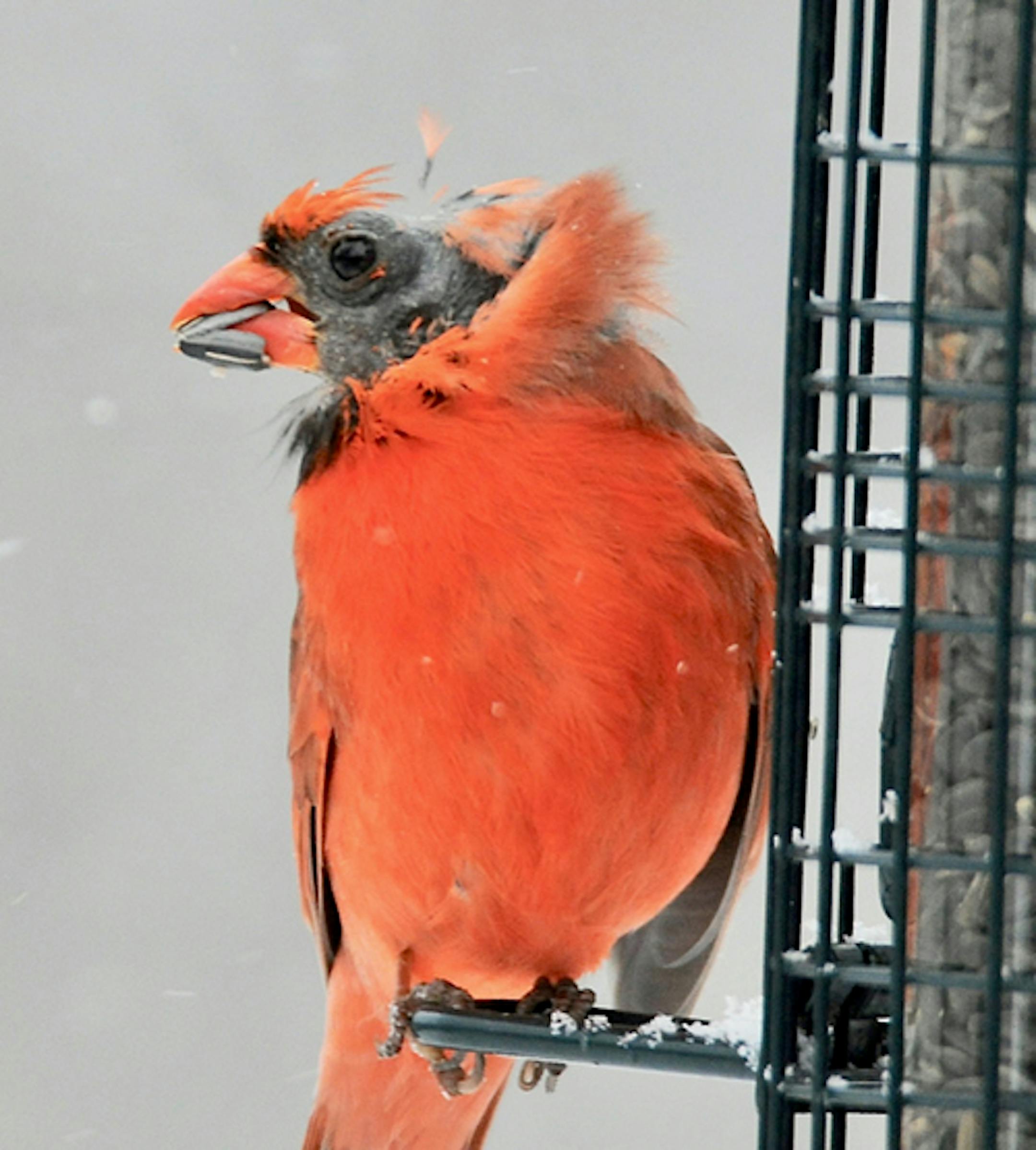 This cardinal looks like it's wearing a parka with the hood pulled back. Nope. It's likely victim of feather mites or lice. It could be abnormal molt, but this isn't a correct time of year for molt. Feather parasites on other parts of the bird's body could be preened away. The head poses an obvious problem. New feathers should grow within a few weeks. Courtship is underway right now. This bird probably won't make a good impression.