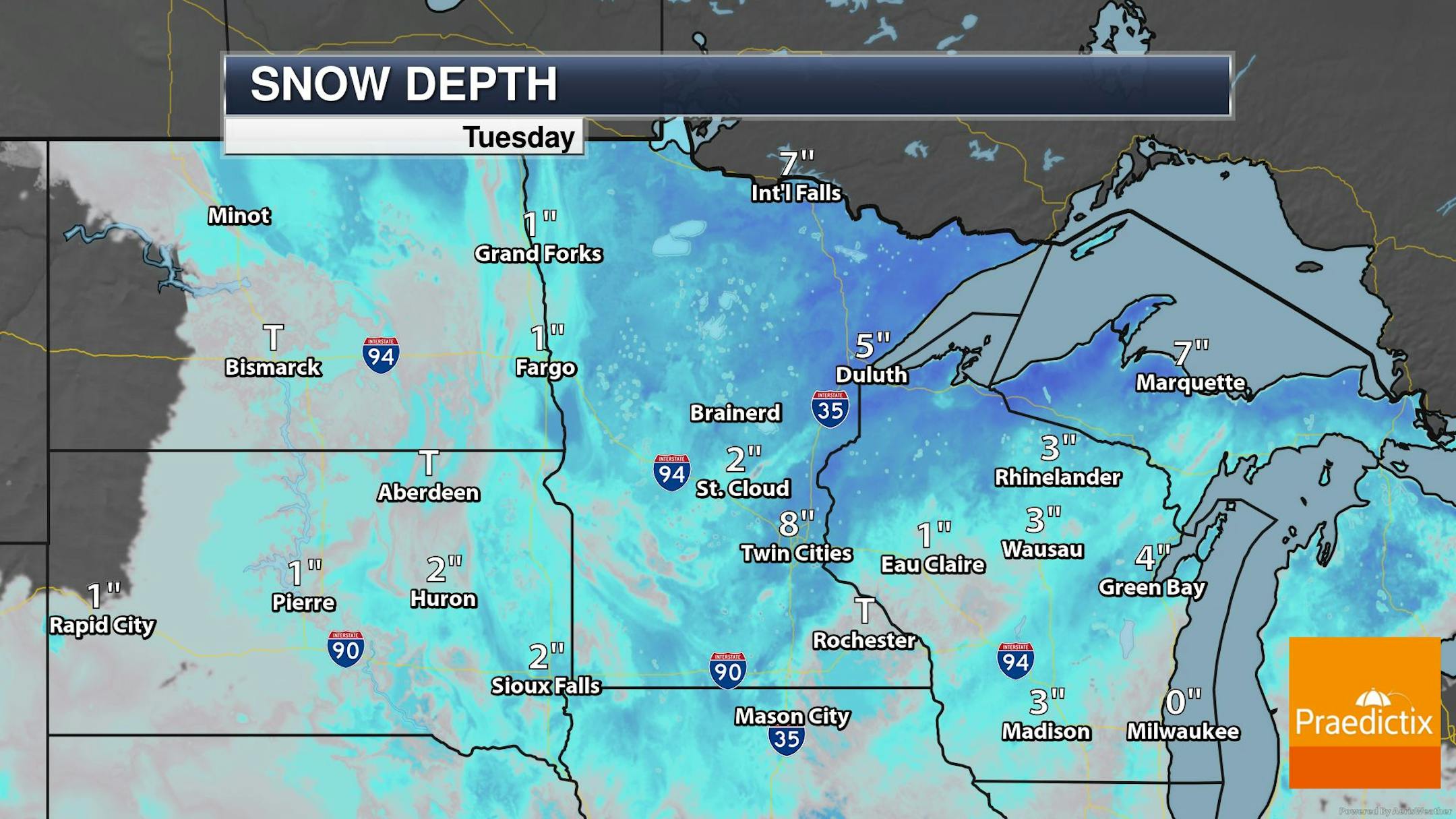 Weather conditions close to home will be rather quiet over the next several days. However, there will be another surge of heavier precipitation that fall south of us from the Central US to the Great Lakes. Areas of heavy snow and ice will be as close to us as Iowa, Illinois and southern Wisconsin once again.