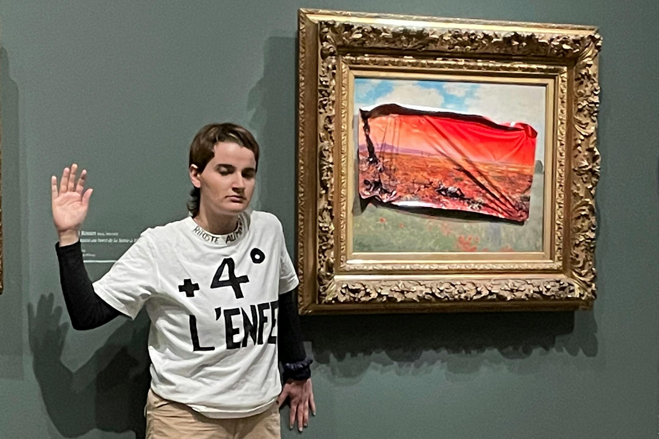 The activist targeted "Poppy Field" by Claude Monet, affixing a sticker that covered about half the painting with an apocalyptic, futuristic vision of the same scene. The group said it's supposed to show what the field would look like in 2100, ''ravaged by flames and drought,'' if more action isn't taken against climate change.