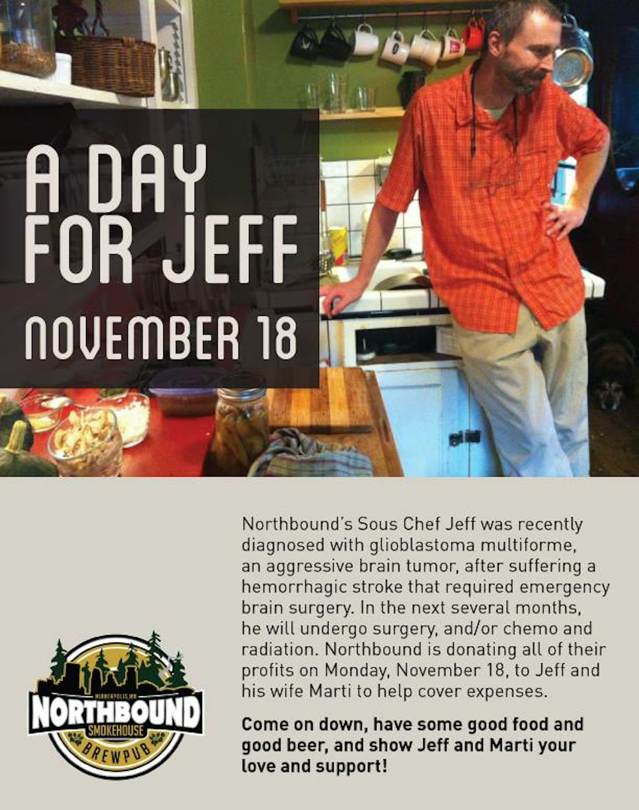 Jeff Robinson the Sous Chef at Northbound Smokehouse Brewpub was recently diagnosed with glioblastoma multiforme which is an aggressive brain tumor that will require surgery and/or chemo or radiation. Northbound is declaring Monday, November 18th A Day for Jeff where they will donate 100% of the profits that day to Jeff and his wife Marti.