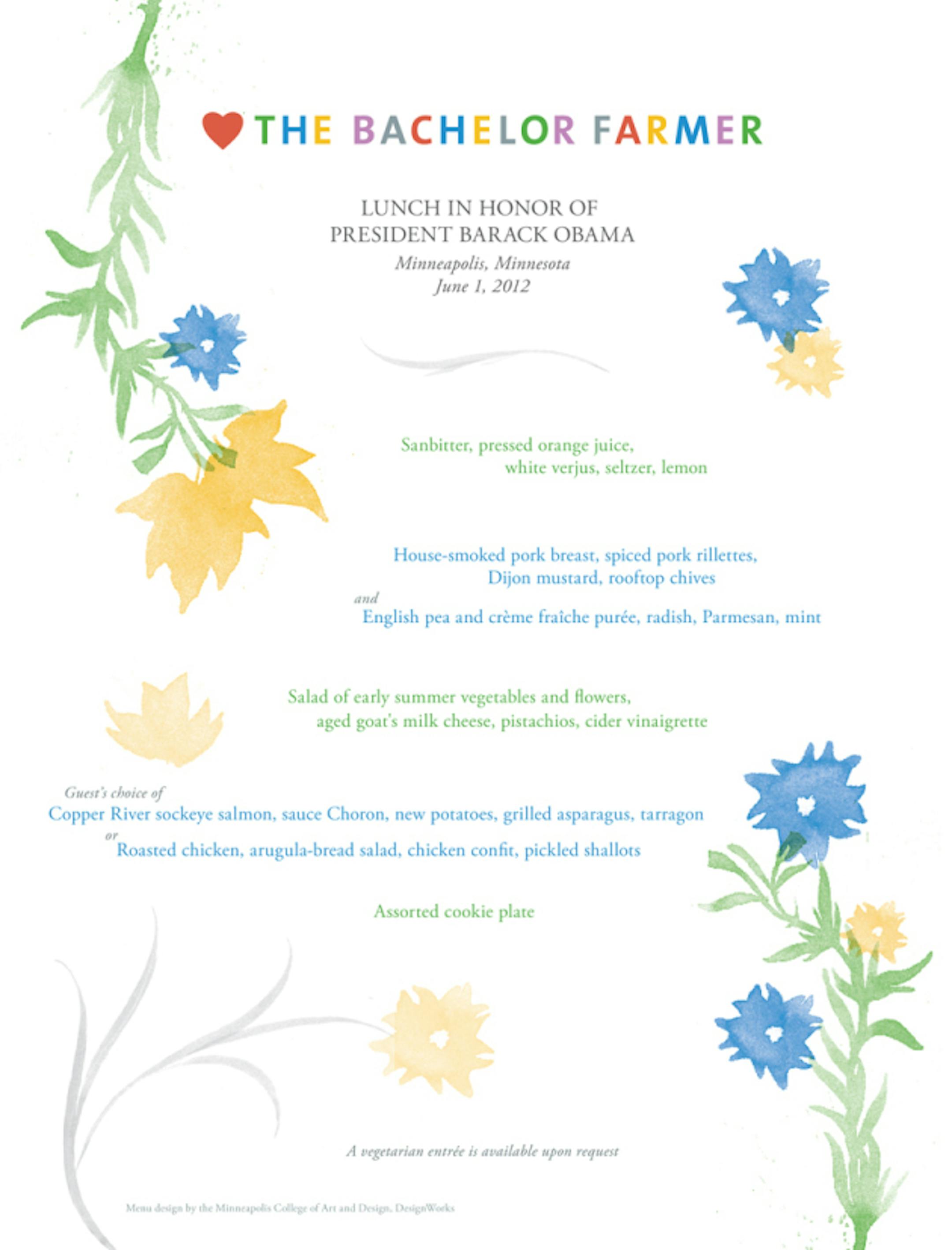 "It was a thrill and a tremendous honor to host the President in our restaurant. And we're incredibly proud of our entire team for the terrific job they did today," Eric Dayton and Andrew Dayton noted in a prepared statement. The lovely menu presentation was created by MCAD DesignWorks, the in-house design studio at the Minneapolis College of Art and Design.