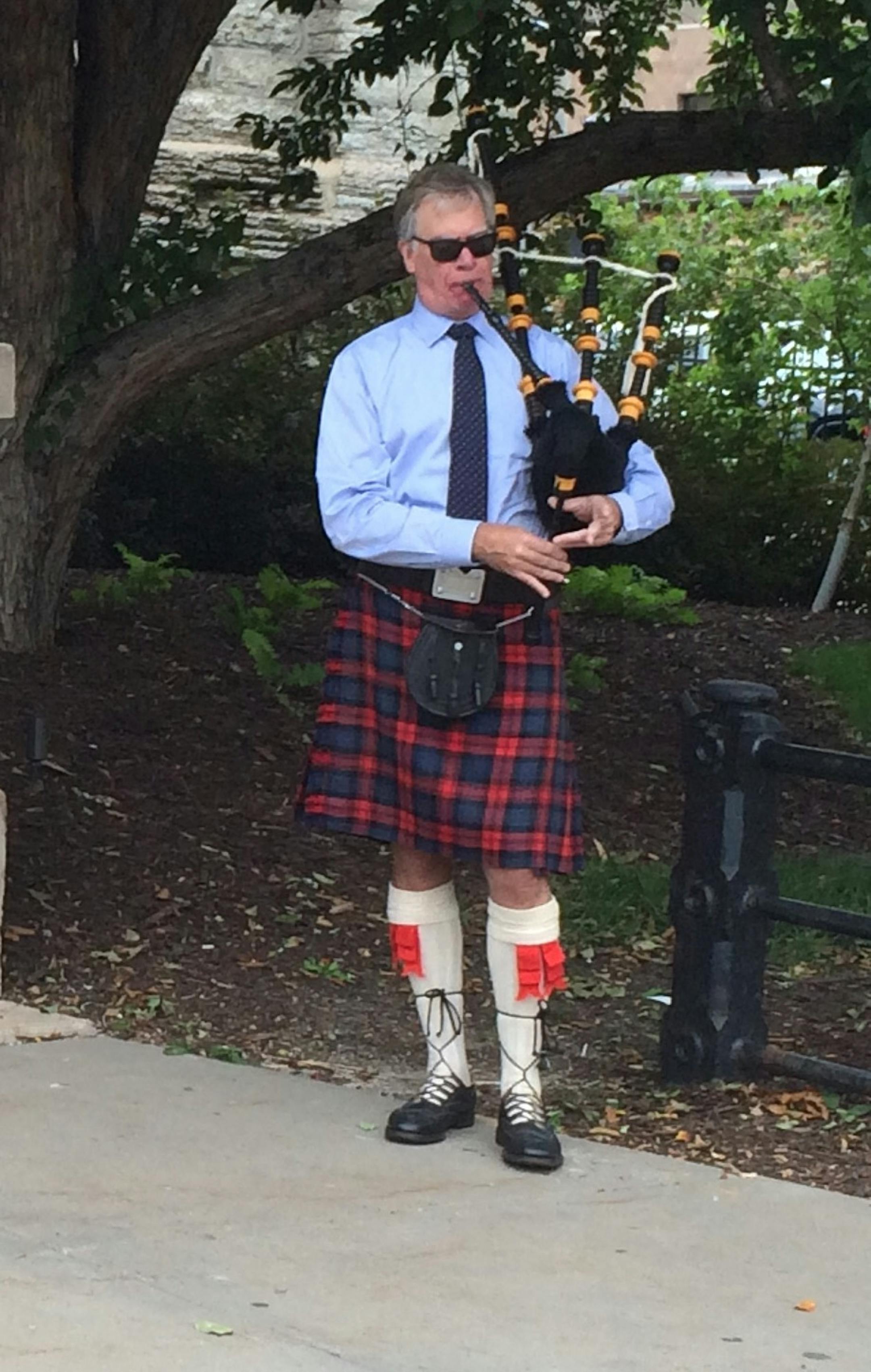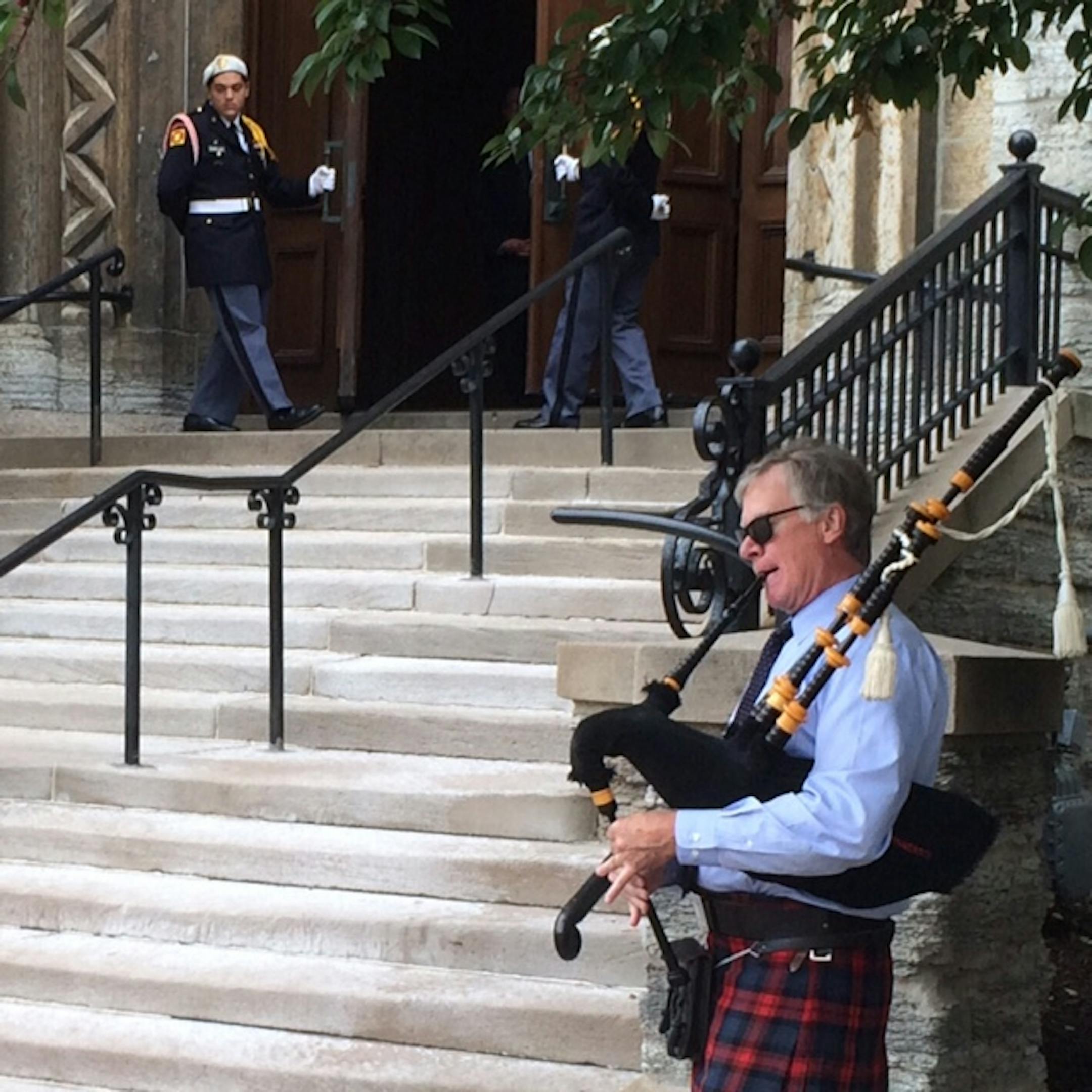 The many friends and family of Minneapolis businessman and civic leader Devin Rice gathered for his funeral Monday morning at Assumption Catholic Church in downtown St. Paul, ushered into the church with bagpipes played by this familiar looking kilt.