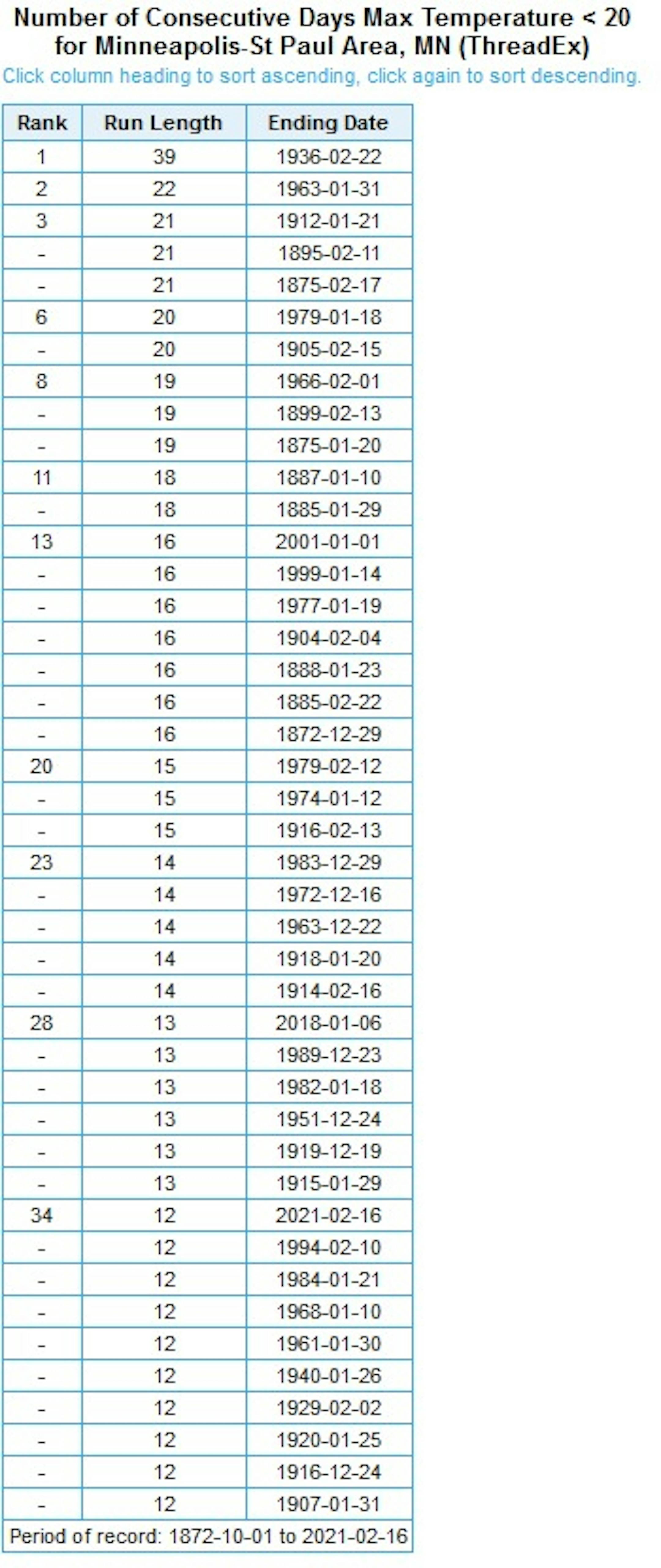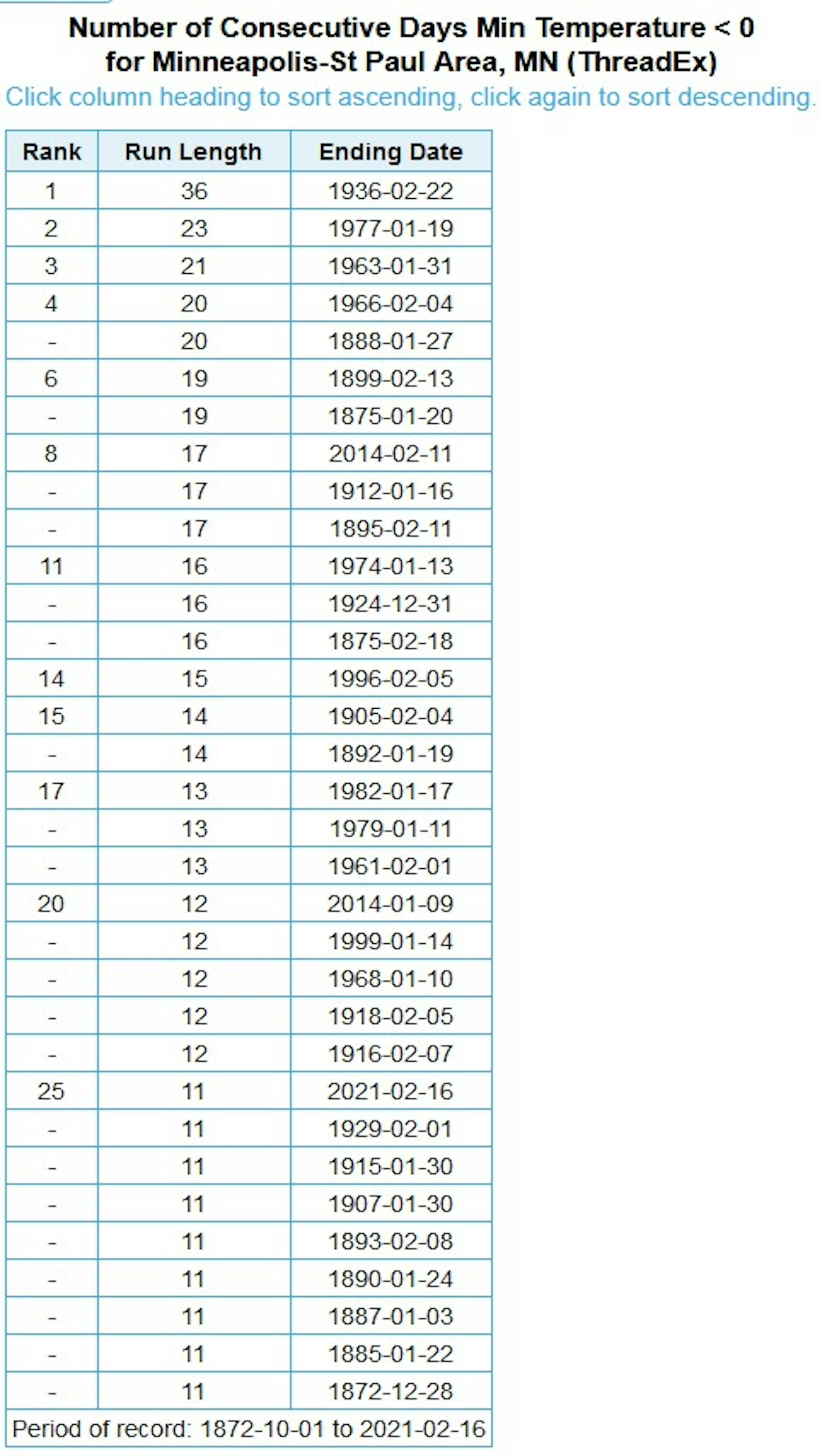 One streak that has ended, however, is our stretch of highs colder than +10F. The high on Tuesday climbed to 12F, which ended the streak at 10 days - tied for 8th place.