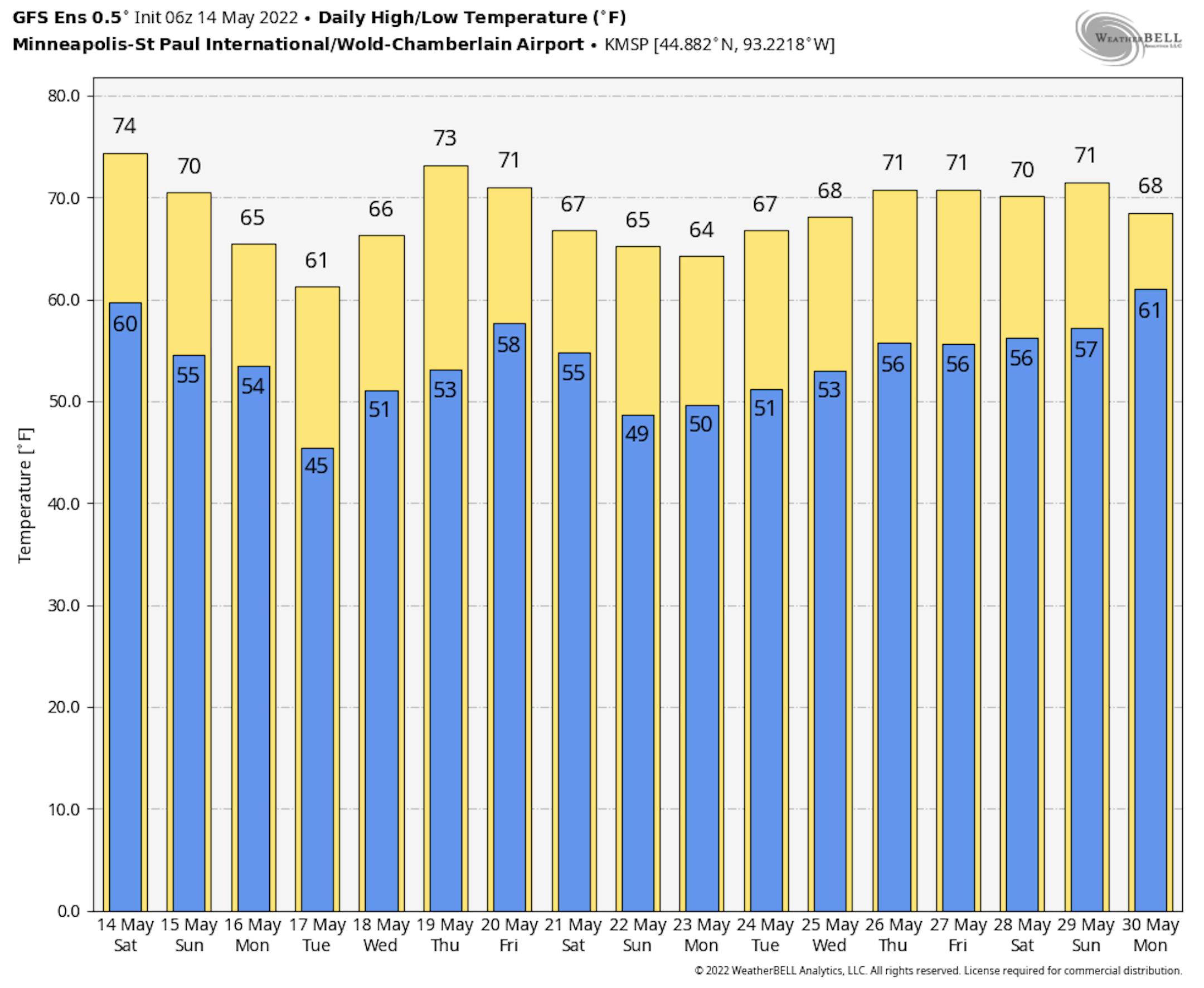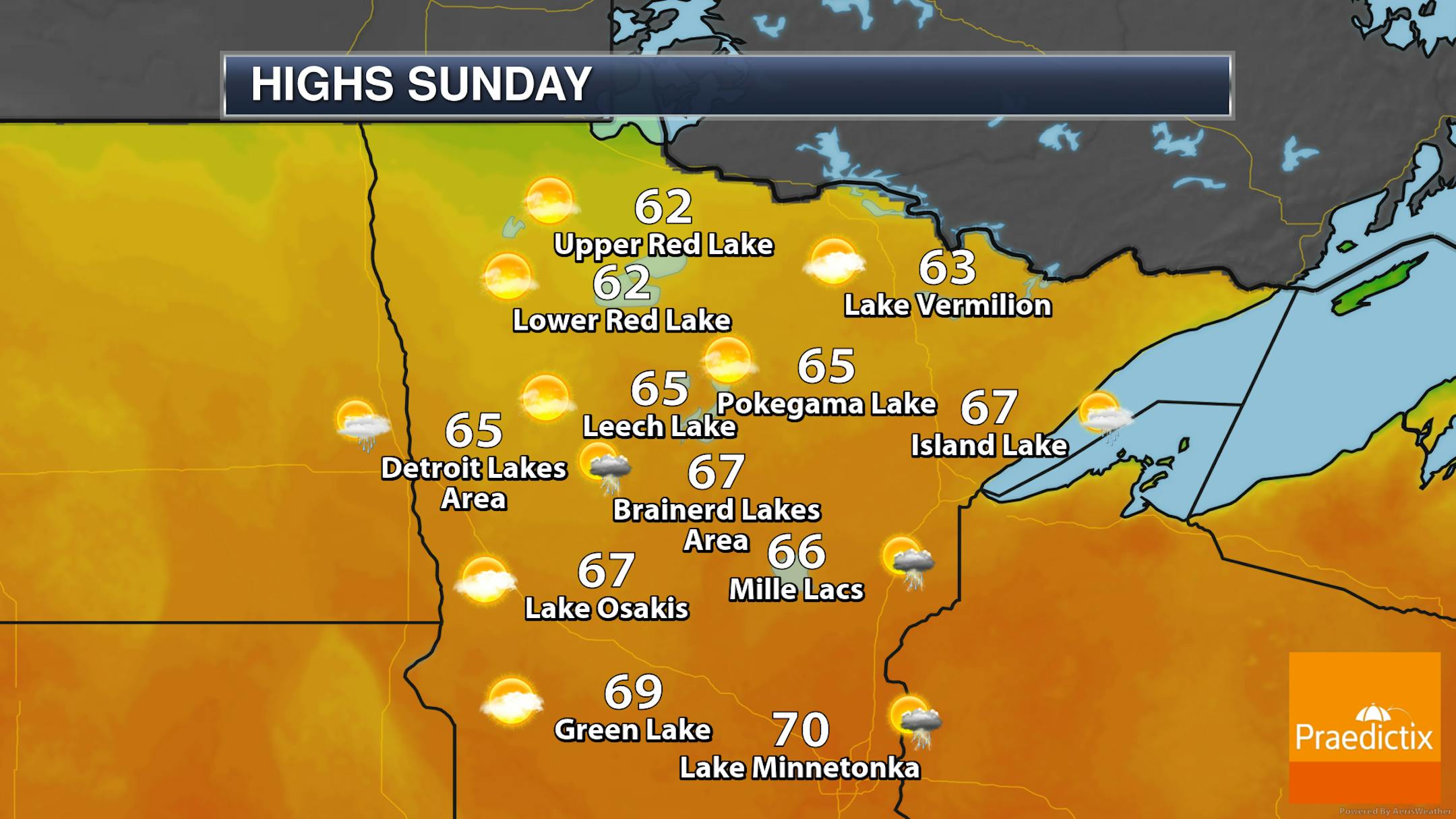 As we look at some of the lakes across northern/central Minnesota, temperatures will generally be in the 60s - a little warmer as you head toward Lake Minnetonka, and a little cooler toward Lake of the Woods where they may only be in the 50s. We watch that isolated rain chance, otherwise a fairly nice day if it weren't for some breezy winds.