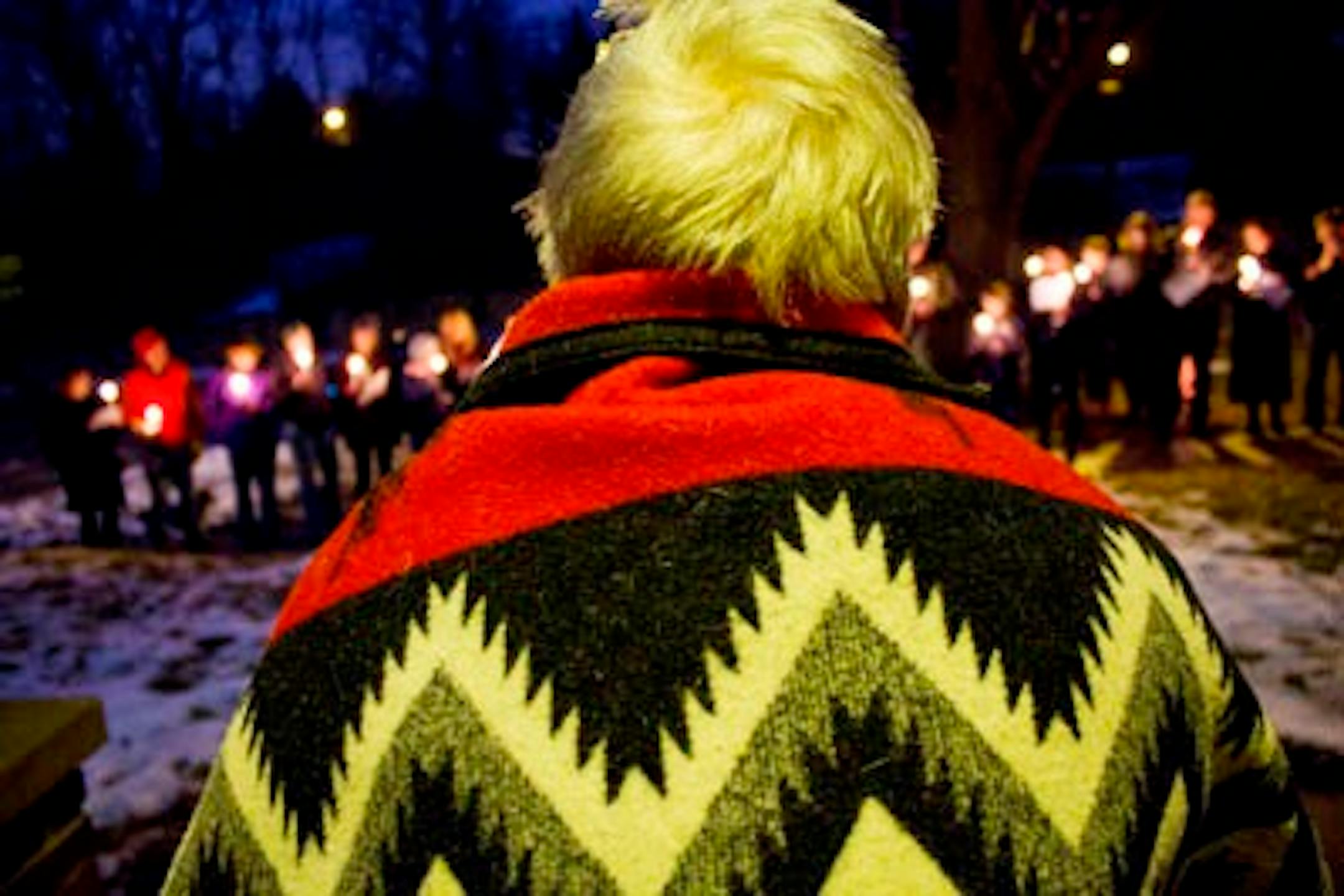 Carolers at Ann Marsden's home. Photos by Rich Ryan. Leading Twin Cities photographer Ann Marsden was diagnosed with cervical cancer in July 2010. She has undergone several intensive treatment regimens, including another round of chemotherapy that began in early December. She cannot have visitors, which friends describe as a trial for this people person. So, on Monday evening, more than two dozen neighbors and members of the Twin Cities performing arts community came together outside her home in St Paul to show their love. Bearing candles and sweet spirits, they sang carols to Marsden, who came out and watched, beaming. The evening was organized by Mary Petrie, a neighbor and women's studies professor, and Twin Cities stage star Stacia Rice. "Like most people, we felt helpless in the face of illness," said Petrie. "And we wanted to give her some energy." The carolers sang such songs as "Silent Night" and "O, Holy Night." Actor and chanteuse Ann Michels delivered one of Marsden's favorite songs, Joni Mitchell's "River."