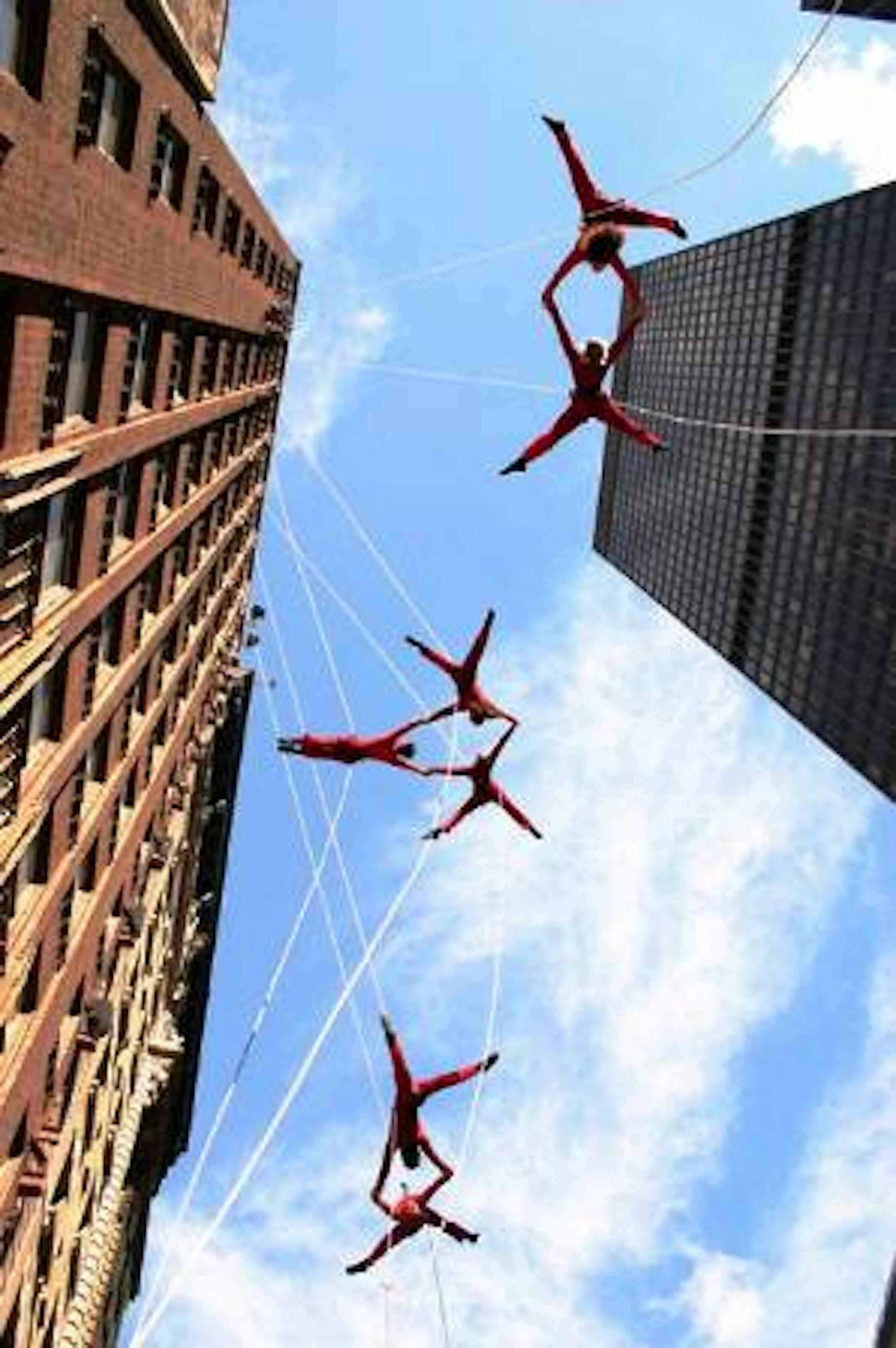The Puppet State Theatre of Scotland is coming to St Paul this summer. So is the Oyu Oro Afro-Cuban Dance Ensemble (pictured above) and Project Bandaloop (pictured below), a West Coast-based aerial troupe founded by dancer-athlete Amelia Rudolph and known for performing while suspended from skyscrapers, mountains and sheer cliffs. Project Bandaloop will perform suspended from the top of the 13-story Lawson Commons Building in St Paul.