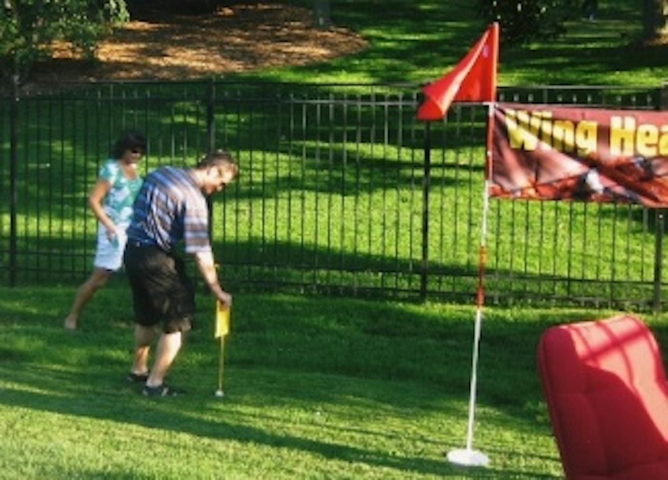 I am an Event Planner by trade, and this event is my baby! I plan for it all year! Our next door neighbors own the Big 10 restaurant down at the U, and they help sponsor the tournament with beer and wings! People typically bring an appetizer or dessert to share, but we provide the beautifully groomed course (thanks to TORO, which is where my husband works as a marketing director), plenty of booze, and a DJ. We have a big water hazard (our pool) in which we have a floating green should there be a playoff.