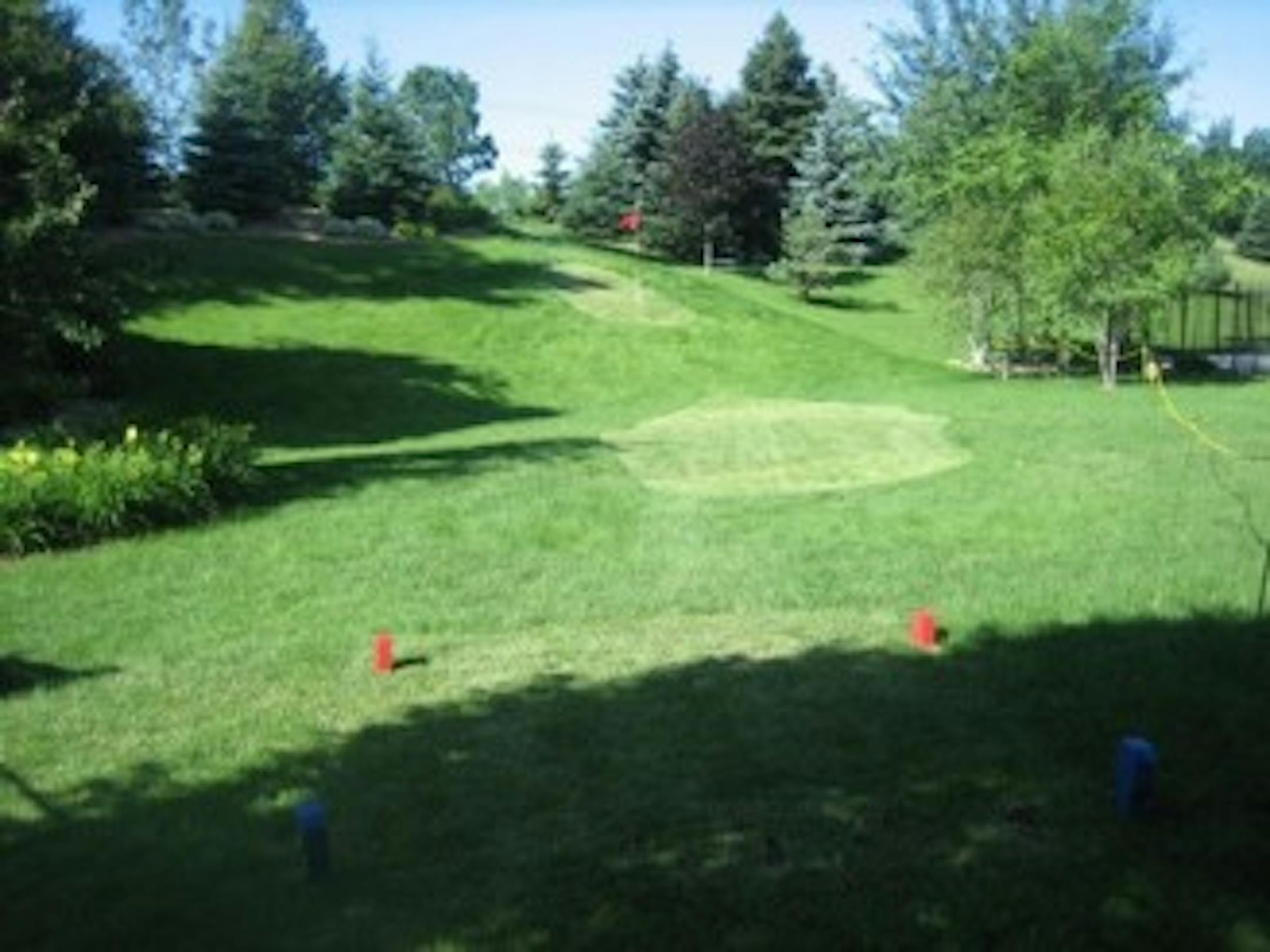 Here is how it works. We let our back yard (as well as our neighbors on either side of us) grow for a couple of weeks, then John mows out a 5 hole course. You play with 1 club (typically a 7 iron) and a whiffle ball. Your drive on each hole HAS to land in the fairway, or you take a 1 stroke penalty. If the weather cooperates, the event is a great evening! We tell people they can come after 3PM to get in a practice round, but beginning at 5PM, all scores count! By 9PM the party is really going strong and the DJ is playing and people are dancing around the pool.