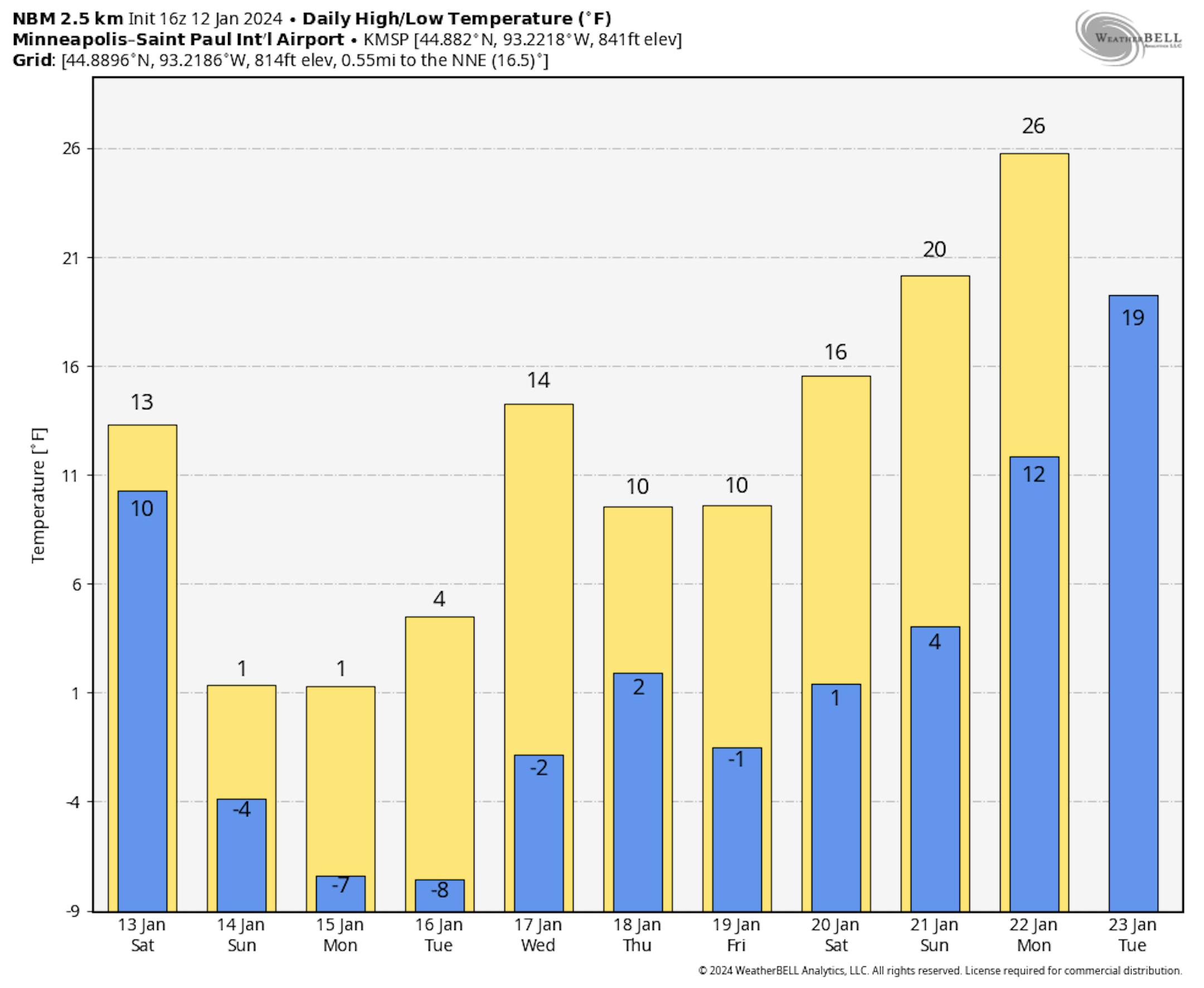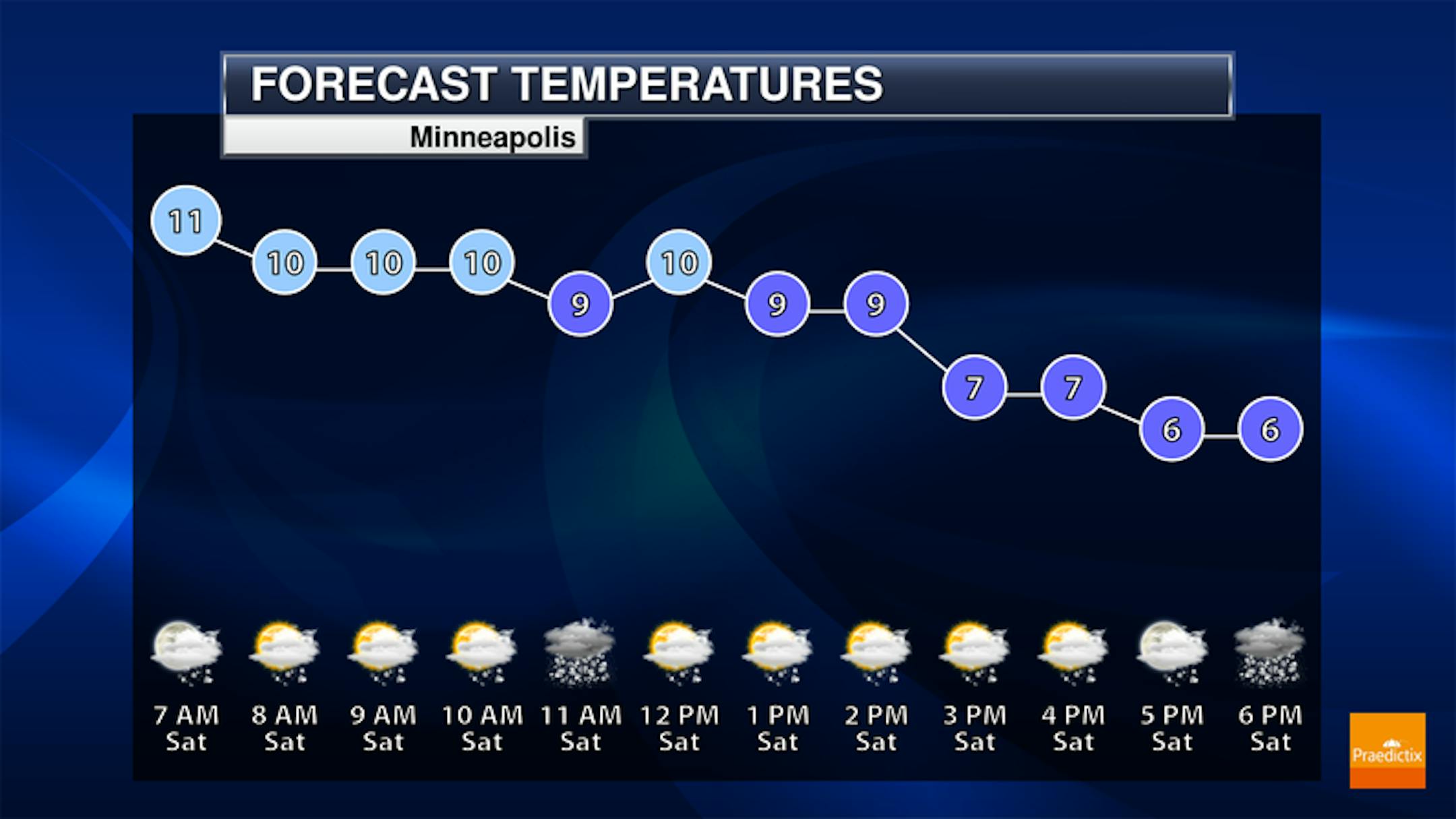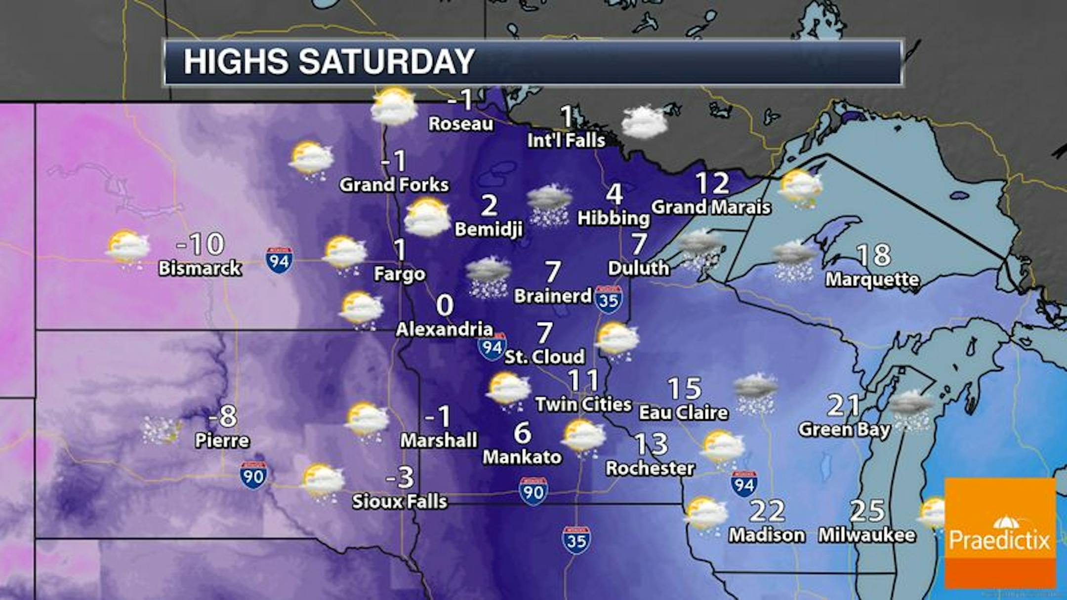 Temps in the Twin Cities over the next several days will see a significant temperature drop. Readings will be MUCH colder as we approach the weekend and into early next week. Daytime highs may only warm into the single digits with overnight lows in the sub-zero range, which will be some of the coldest air in 11 months.