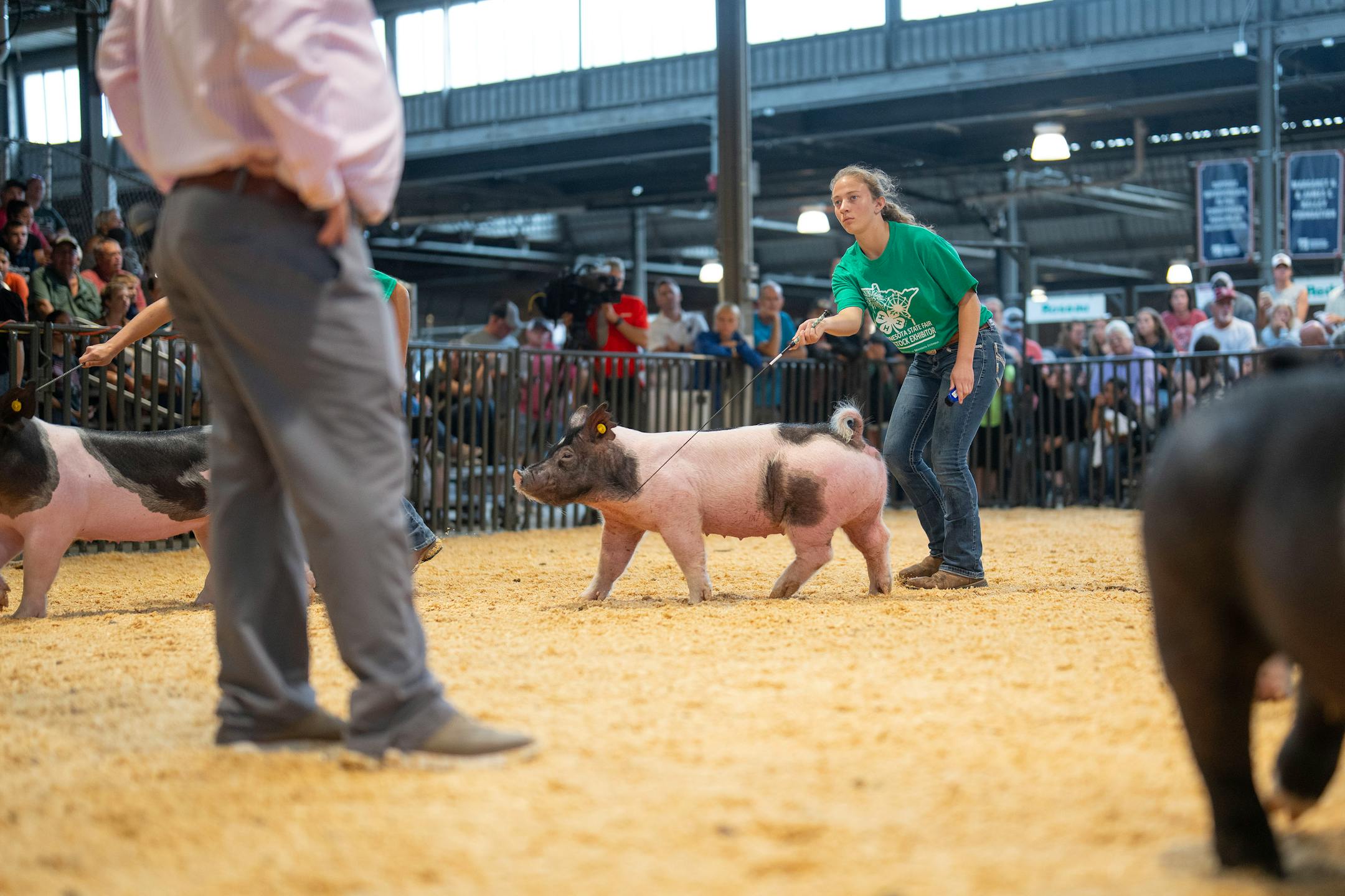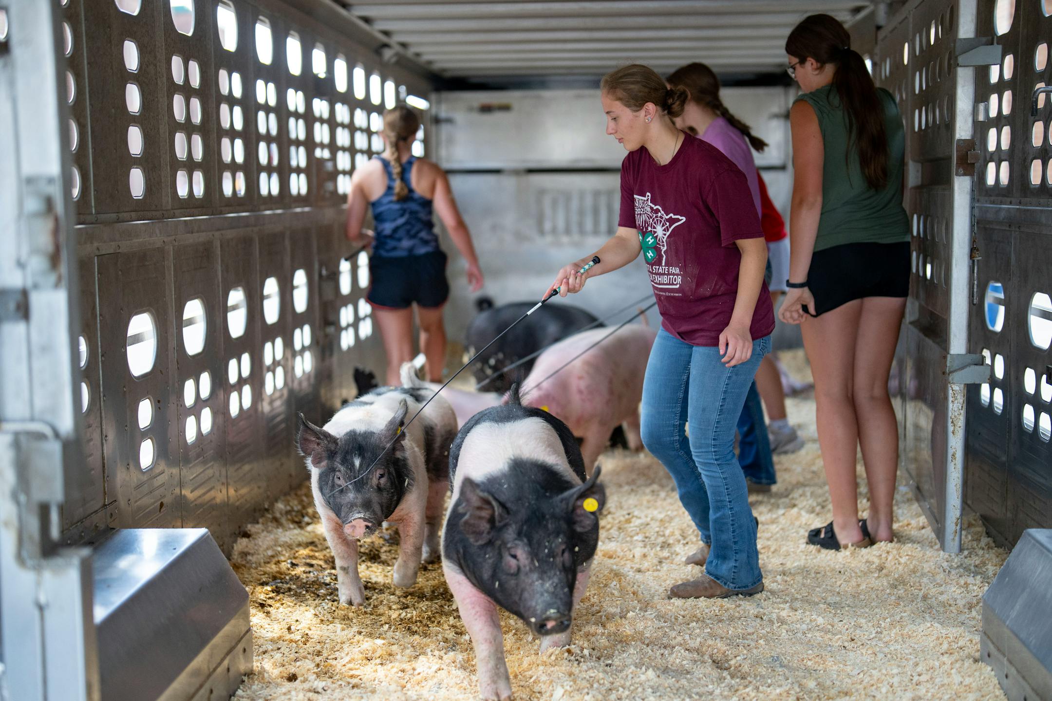 Luella Beckendorf from Watonwan County guides Mocha, her market gilt swine, out of a trailer to a pen in the Christensen Pavilion.