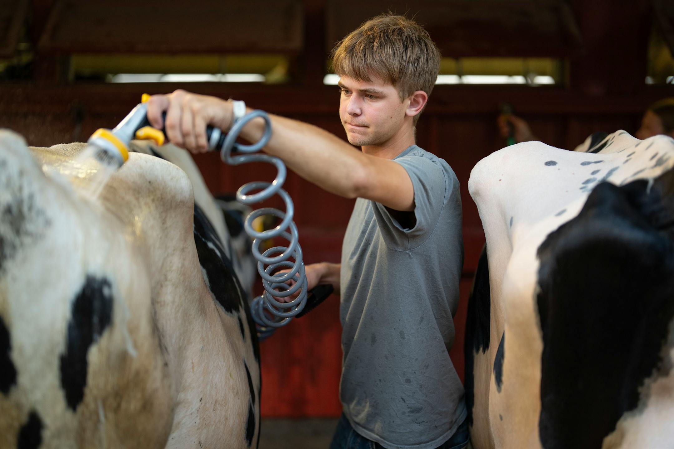 Breckin Anderson gives his Holstein cow, Anne, a good wash on the first day of the fair.