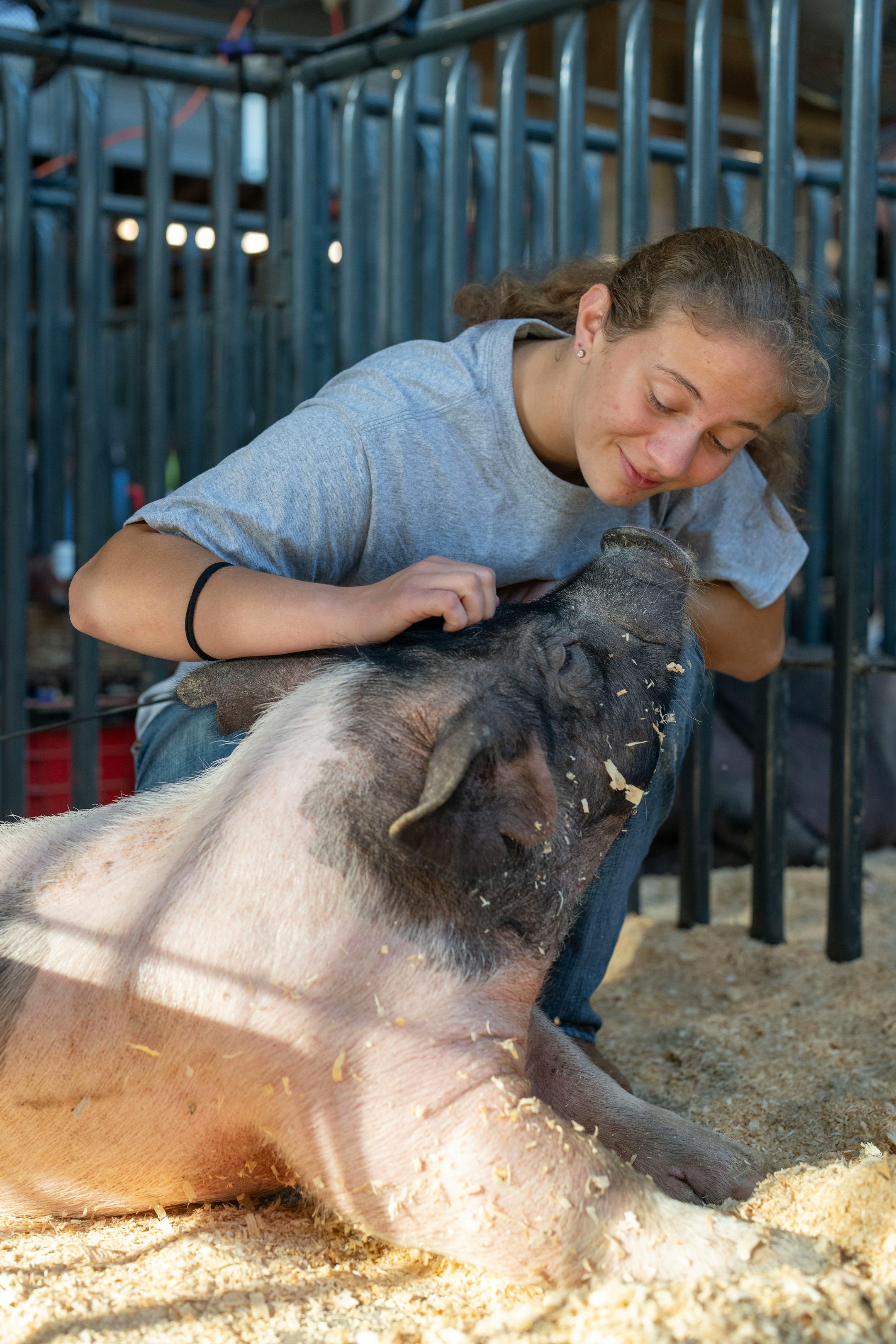 Luella Beckendorf from Watonwan County pets Mocha, her market gilt swine, inside her pen in the Christensen Pavilion at The State Fairgrounds in Falcon Heights, Minn. on Thursday, Aug. 21, 2025. ]