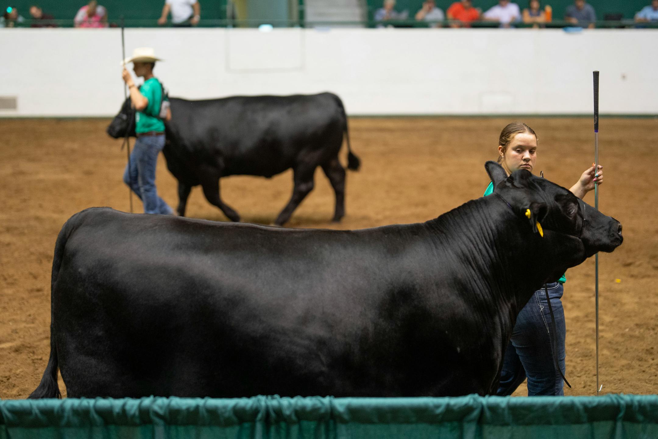Sidney Erickson from Polk County walks Pedro, her British Slick Shorthorn beef steer, alongside other 4H youth as she shows him inside Lee & Rose Warner Coliseum at The State Fairgrounds in Falcon Heights, Minn. on Friday, Aug. 22, 2025. ]