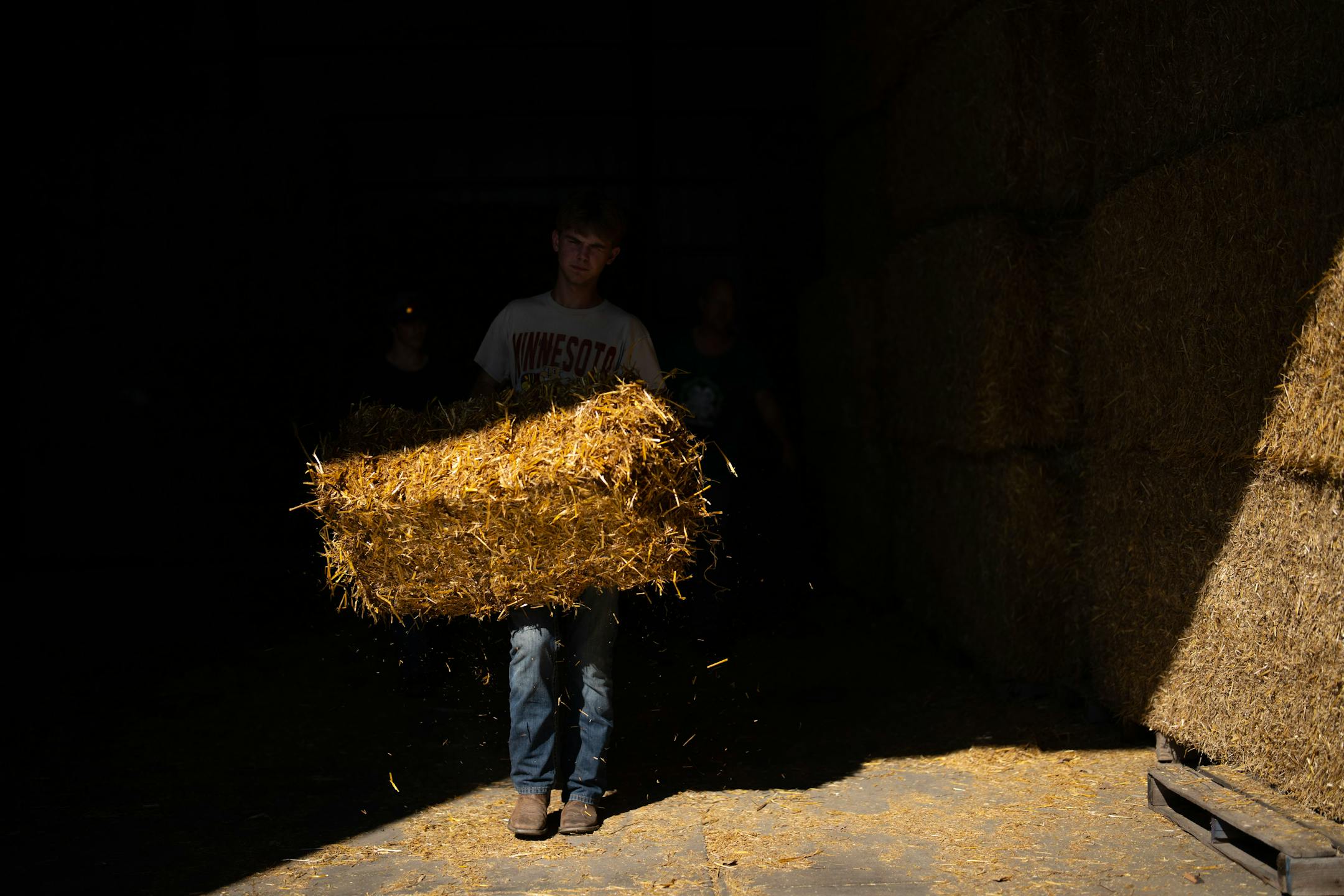 Breckin Anderson brings a bale of straw to the stall of his dairy cow, Anne.