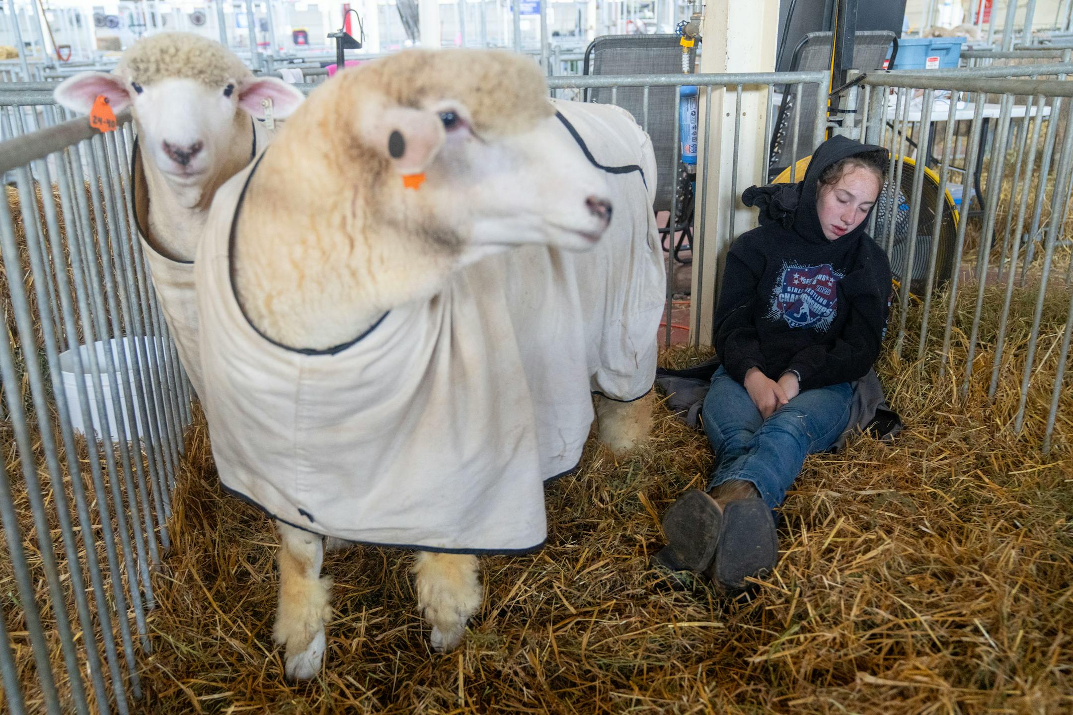 Makenzie Mack from Hubbard County leads her sheep, Molly, back towards her pen inside the Sheep & Poultry Barn after competing in the showmanship championship at The State Fairgrounds on Saturday. (Alex Kormann/The Minnesota Star Tribune)