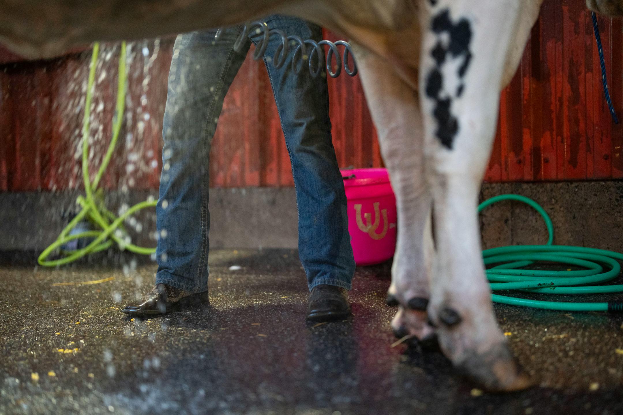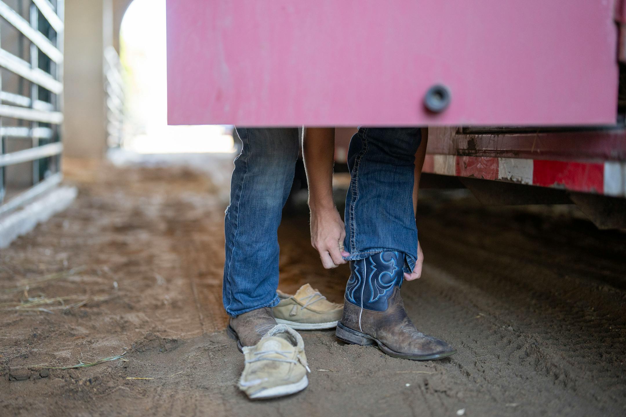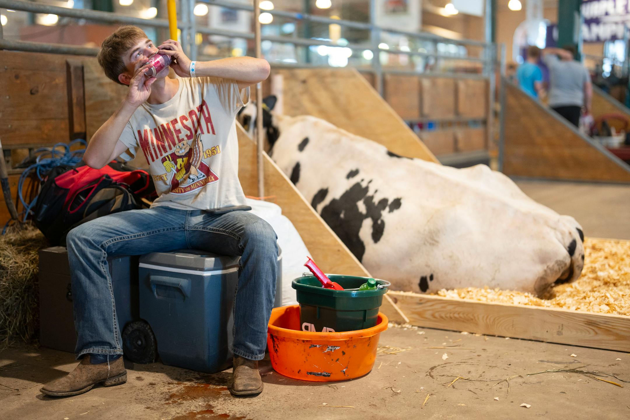 Breckin Anderson from Wilkin County puts on his cowboy boots as he arrives with his dairy Holstein dry-aged cow at The State Fairgrounds on Wednesday. (Alex Kormann/The Minnesota Star Tribune)