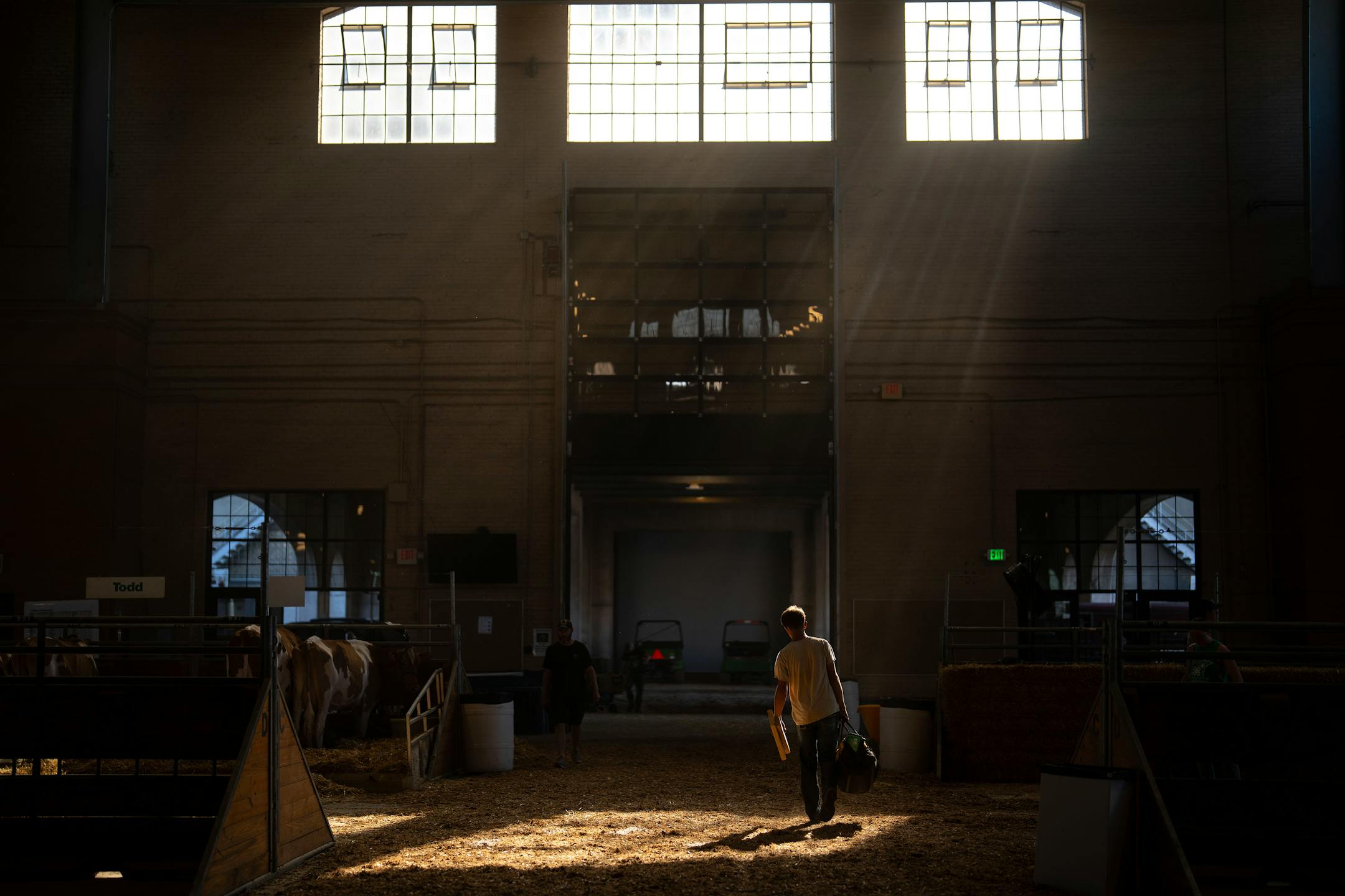 Breckin Anderson from Wilkin County carries a bale of straw out of a shed towards his pen and dairy dry-aged cow, Anne, at The State Fairgrounds in Falcon Heights, Minn. on Wednesday, Aug. 20, 2025. ]
