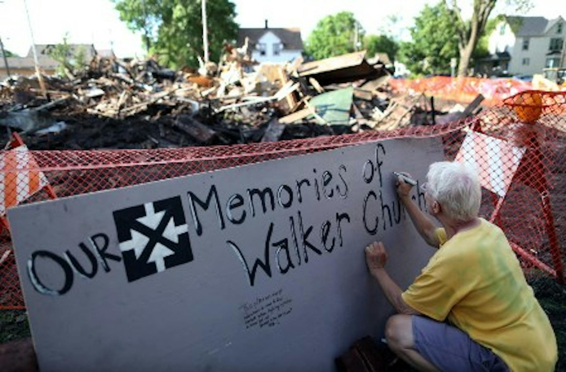 On Monday, Rich Deming signed a board of memories of Walker Community United Methodist Church displayed the the outskirts of what was left after a fire devastated the church the night before (Staff photo by Renee Jones Schneider)