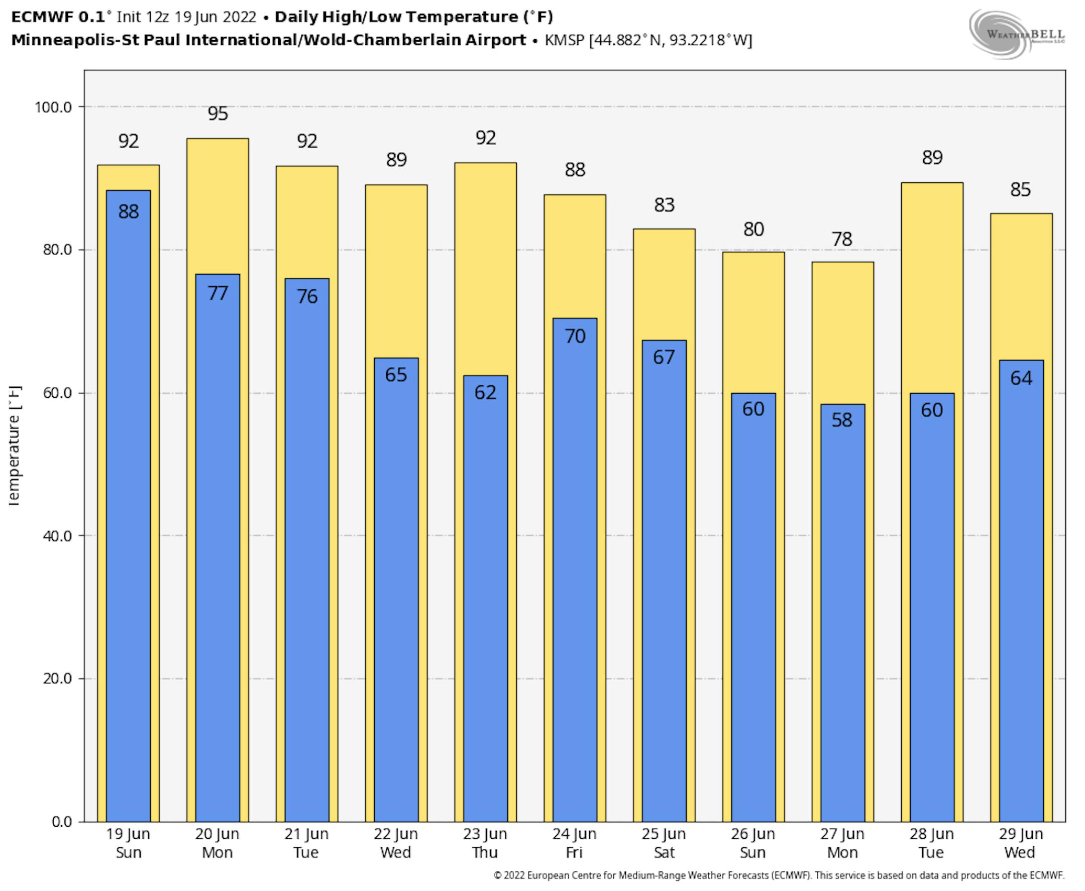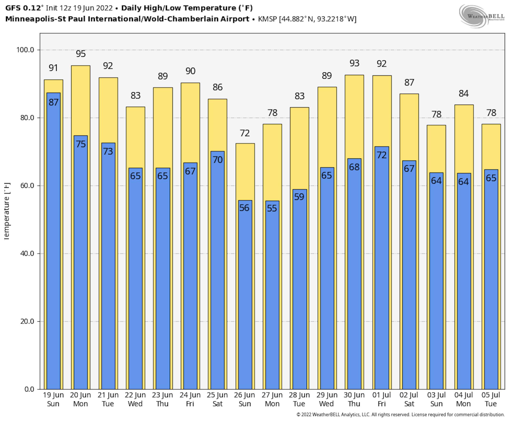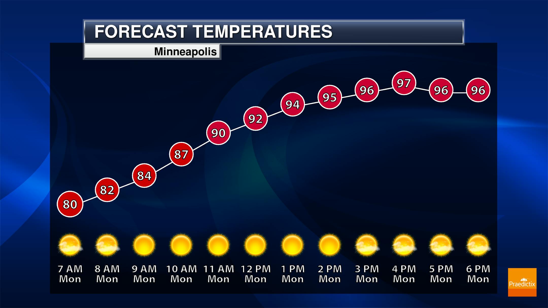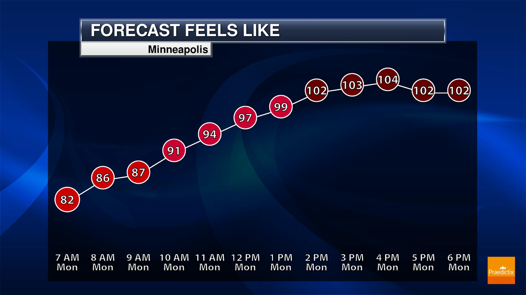Here's the hourly feels like temp for Minneapolis on Monday. Heat index values will quickly warm into the 90s by mid-morning and into the 100s by late afternoon and possibly as high as 106F.