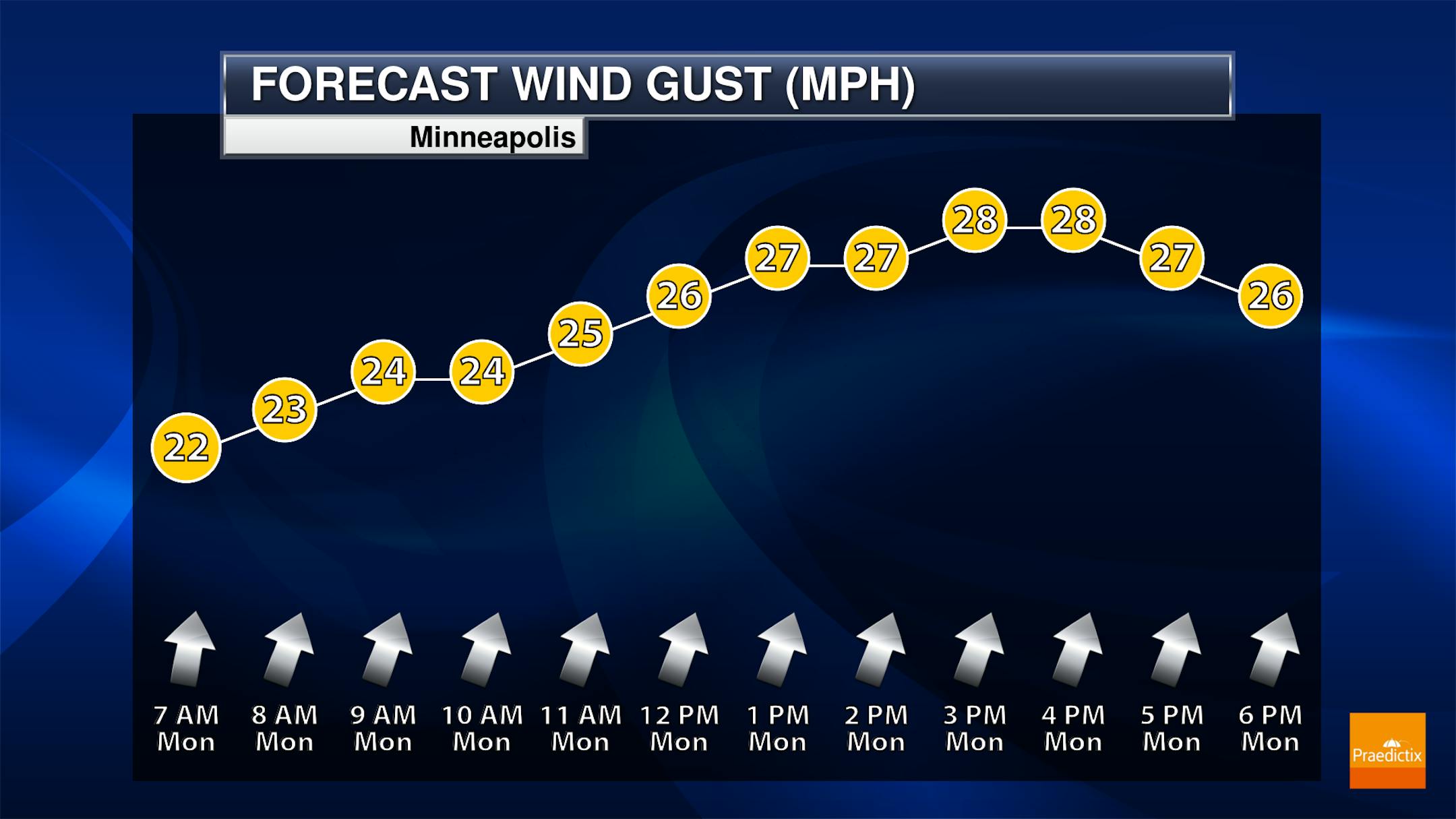 Here's the weather outlook from 7AM Monday to 7AM Tuesday, which shows fairly quiet conditions through much of the day. A frontal boundary will be responsible for a few strong to severe storms late in the day Monday with wind and hail as the primary concerns. There could also be a few pockets of heavy rainfall.