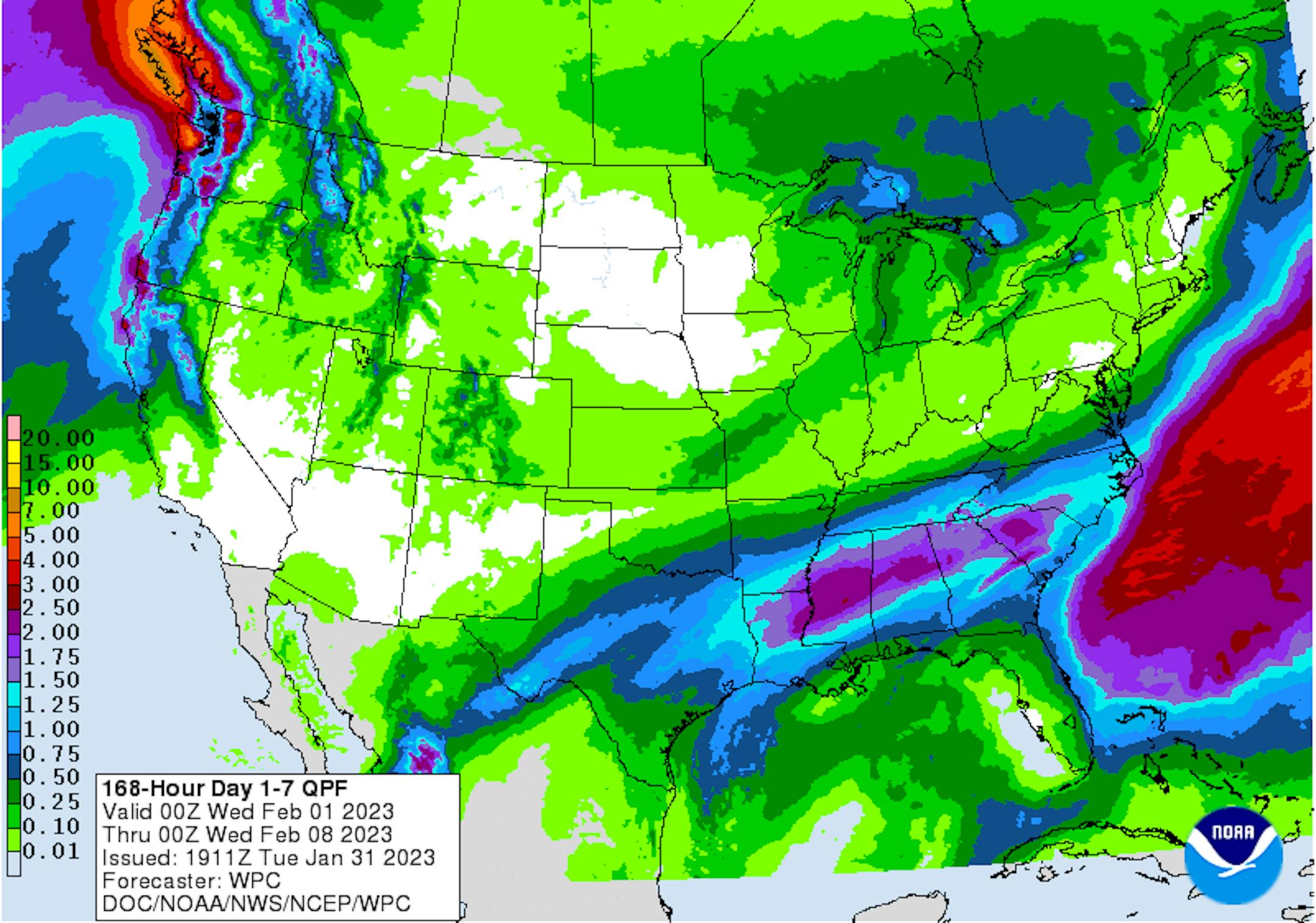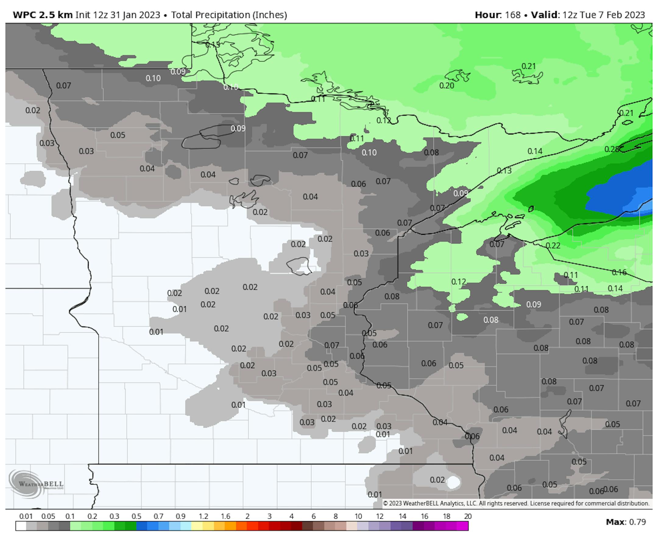 The extended precipitation outlook from NOAA's WPC shows fairly minimal amounts through the weekend ahead. Anything that falls will generally be light and confined to the northern part of the state.