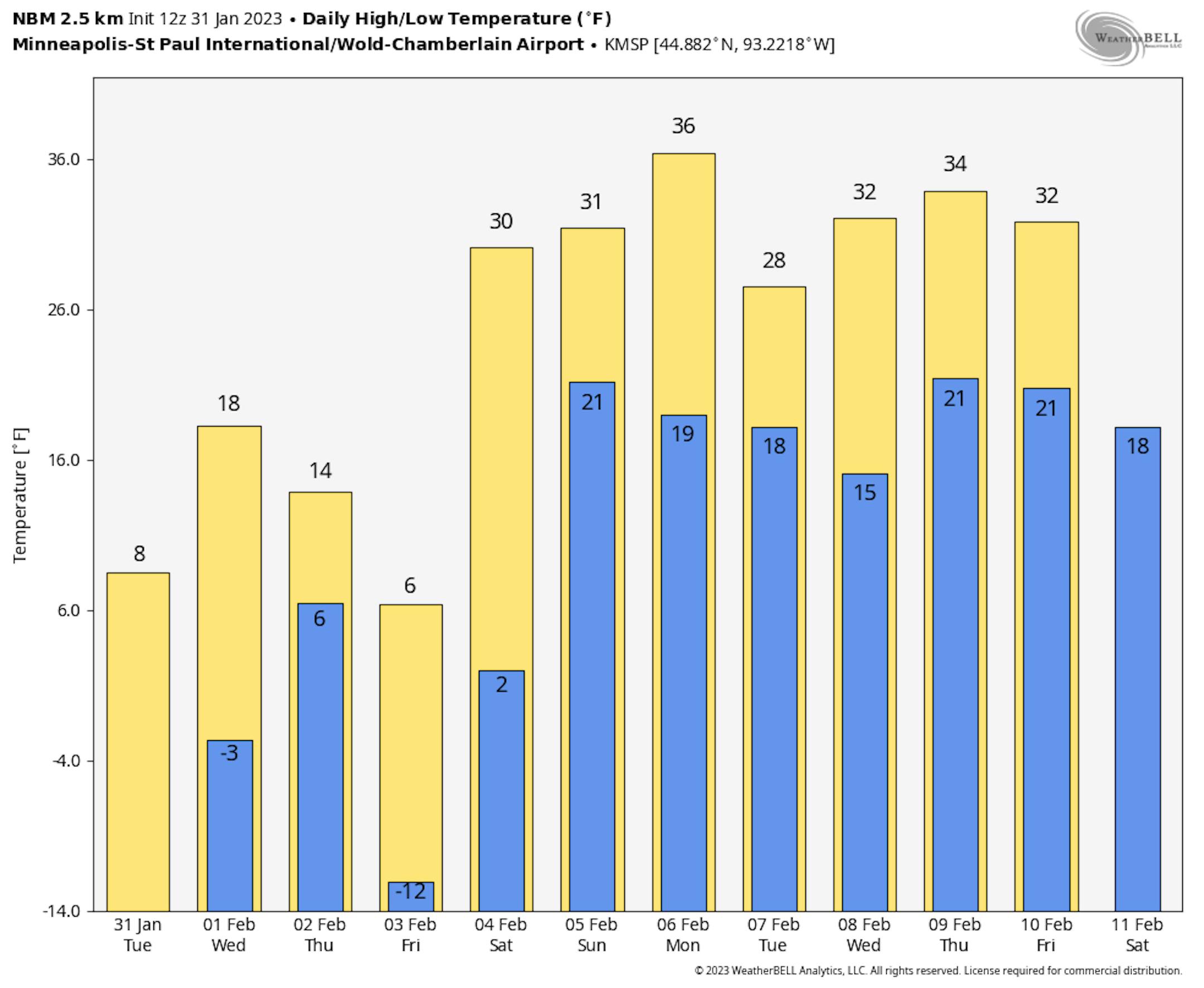 The NBM extended temperature outlook for Minneapolis shows pretty chilly temps in place though the week ahead. Friday will be another very cold day with highs only warming into the single digits and subzero wind chills. Readings will then warm back into the 20s and 30s for the first weekend of February and into the first full week of the new month.