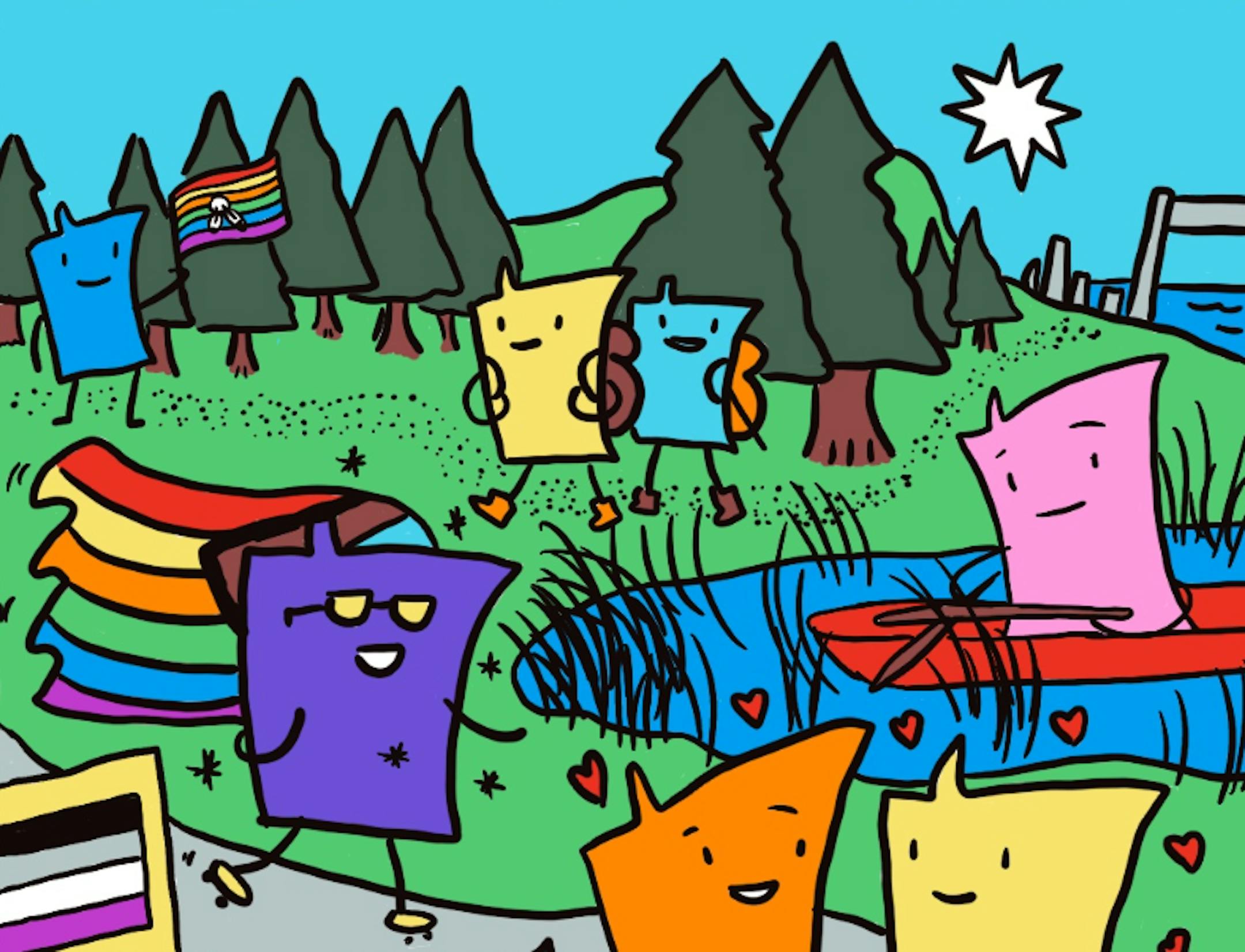 Denver-based illustrator B. Erin Cole, who used to work at MNHS, contributed six colorful illustrations based off images in the map project. In one illustration, Minnesota-shaped characters are shown waving Pride flags, canoeing through a lake with wild rice. One is even holding a hot dish.