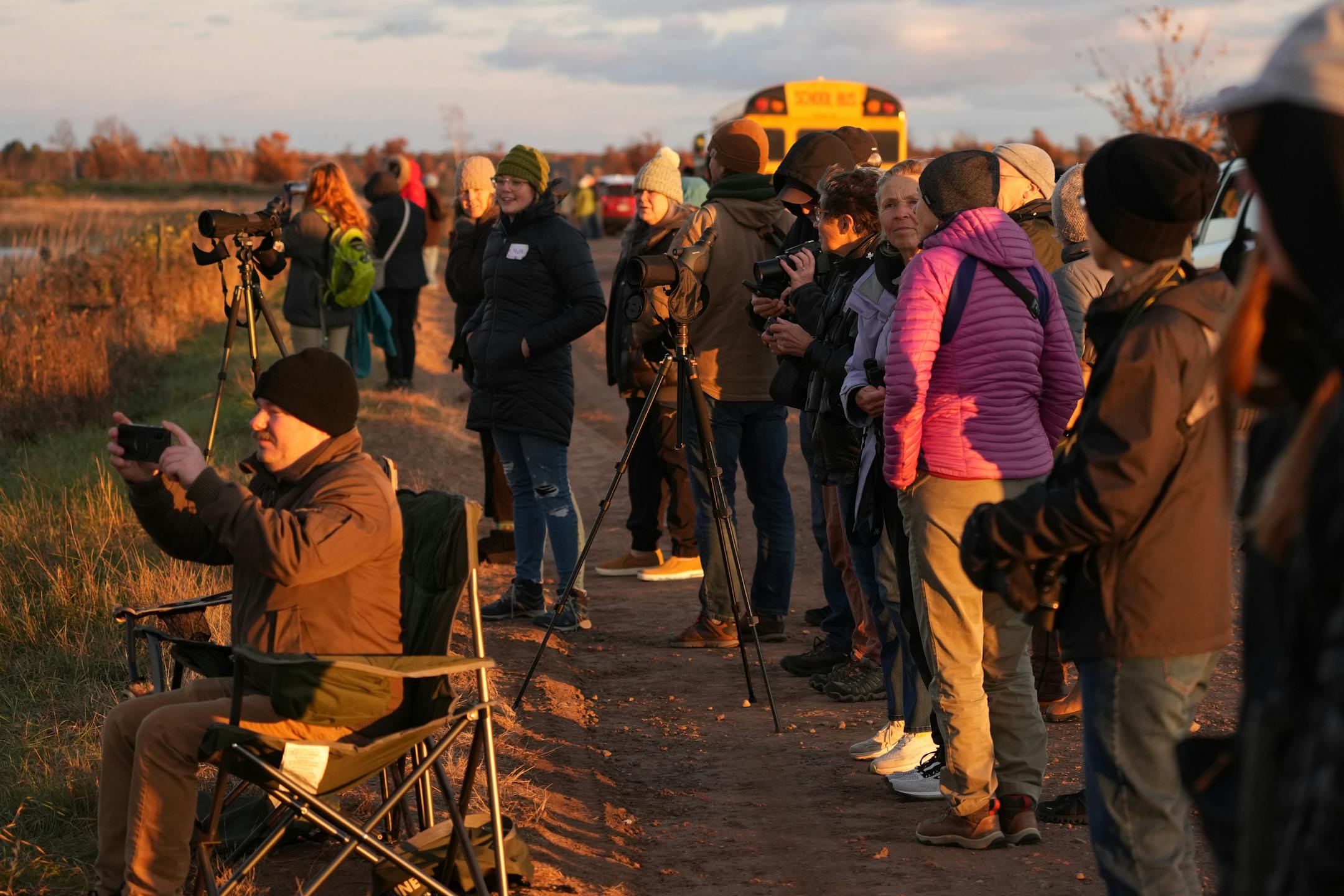 On Wednesday, the spectators stood on an interior road straddling a Crex marsh where the cranes land and sit tight for the night. Some people were with employees from the International Crane Foundation, based in Baraboo, Wis., who were in town to partner with the Crex Meadows Wildlife Area visitor center for a guided tour. It sold out.