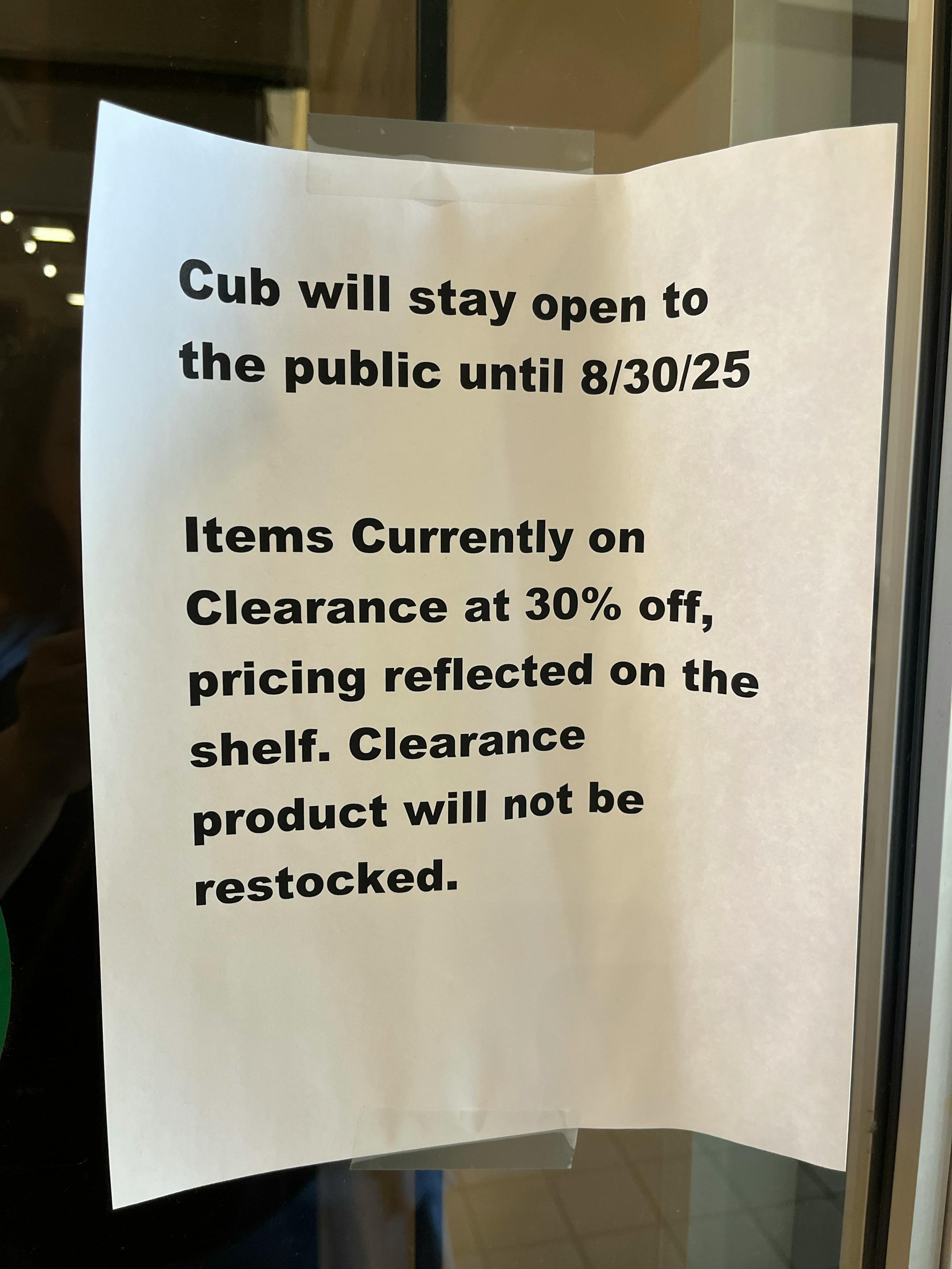 “Cub will stay open to the public until 8/30/25,” the note read. “Items Currently on Clearance at 30% off, pricing reflected on the shelf. Clearance product will not be restocked.”