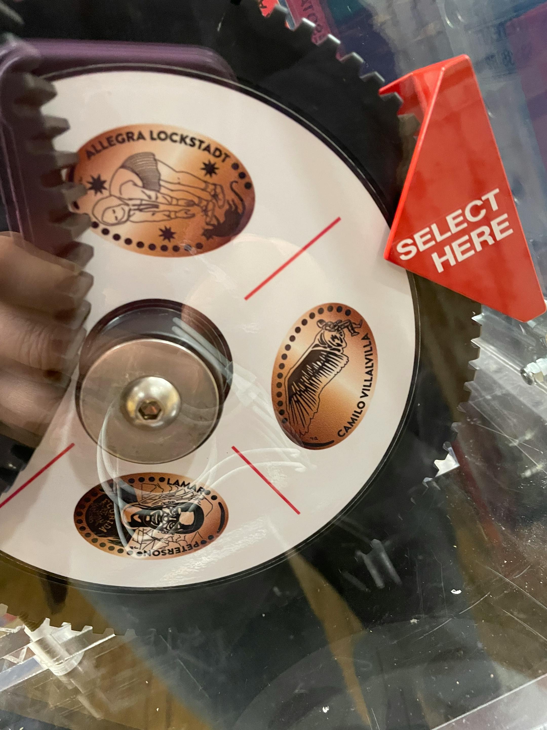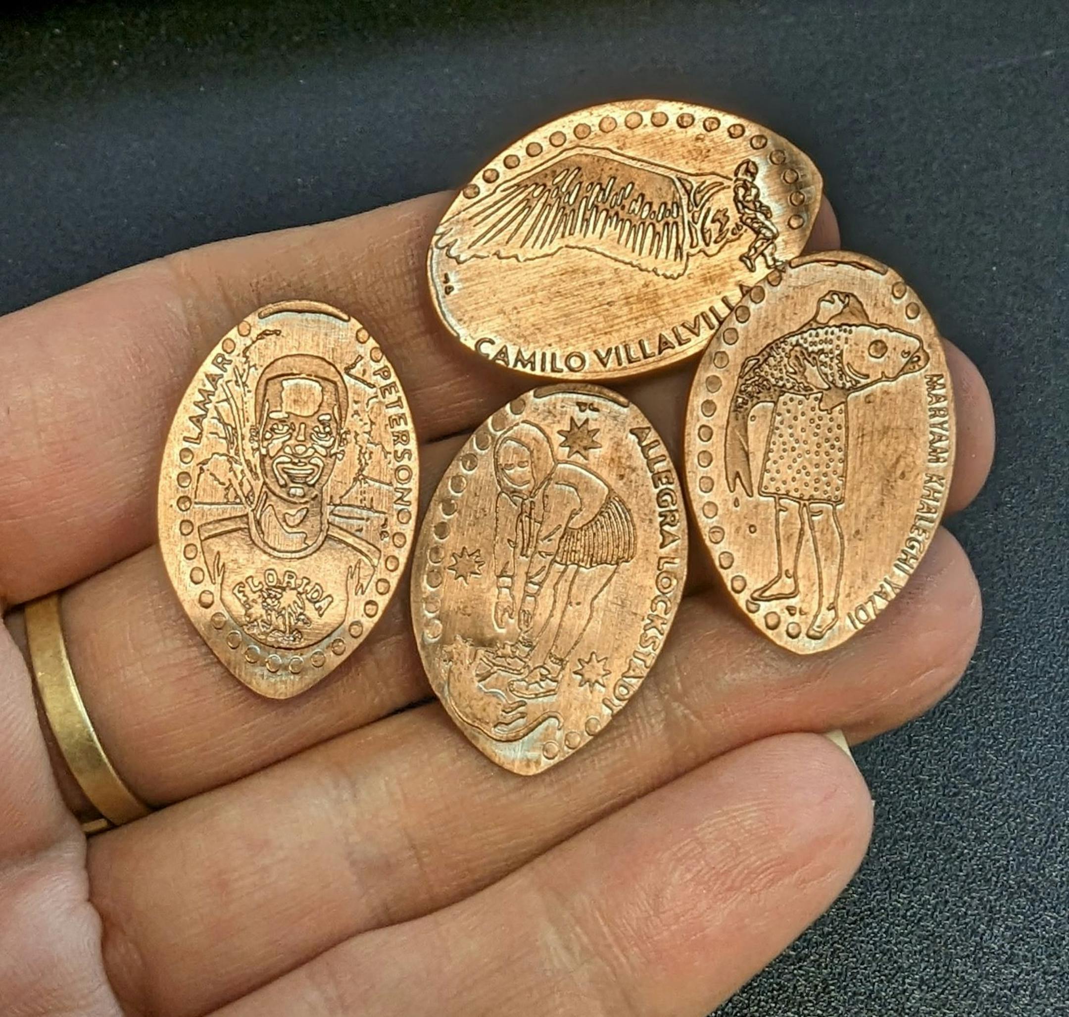 The current selection of custom-made penny-pressed art is by artists Maryam Khaleghi Yazdi, Allegra Lockstadt, Lamar Peterson and Camilo Villalvilla.