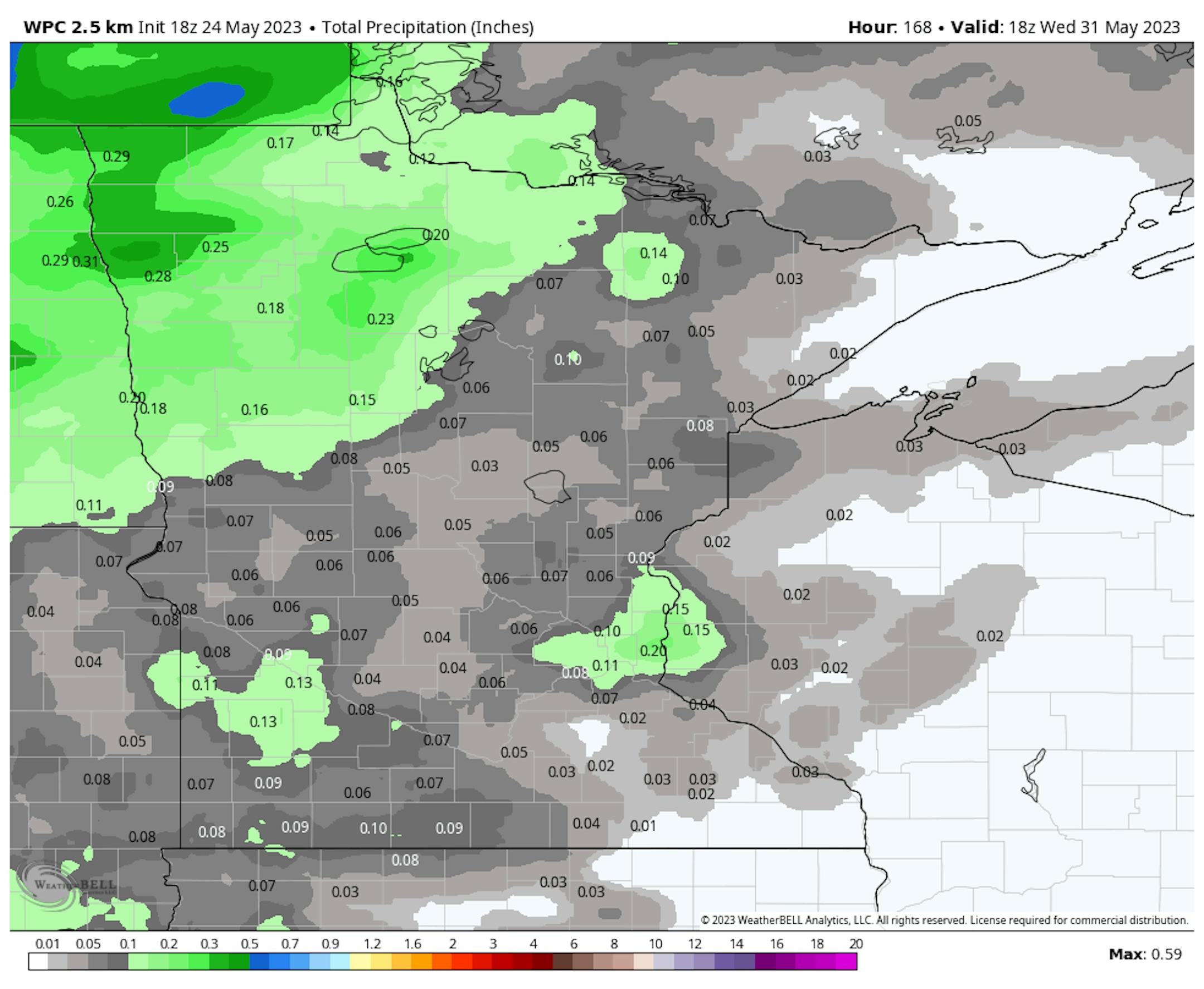 The precipitation outlook through mid-week doesn't appear to be all that impressive with some locations seeing 0.25" to 0.50" tallies across the northern part of the state. Much of southern Minnesota, including the Twin Cities could be completely dry.