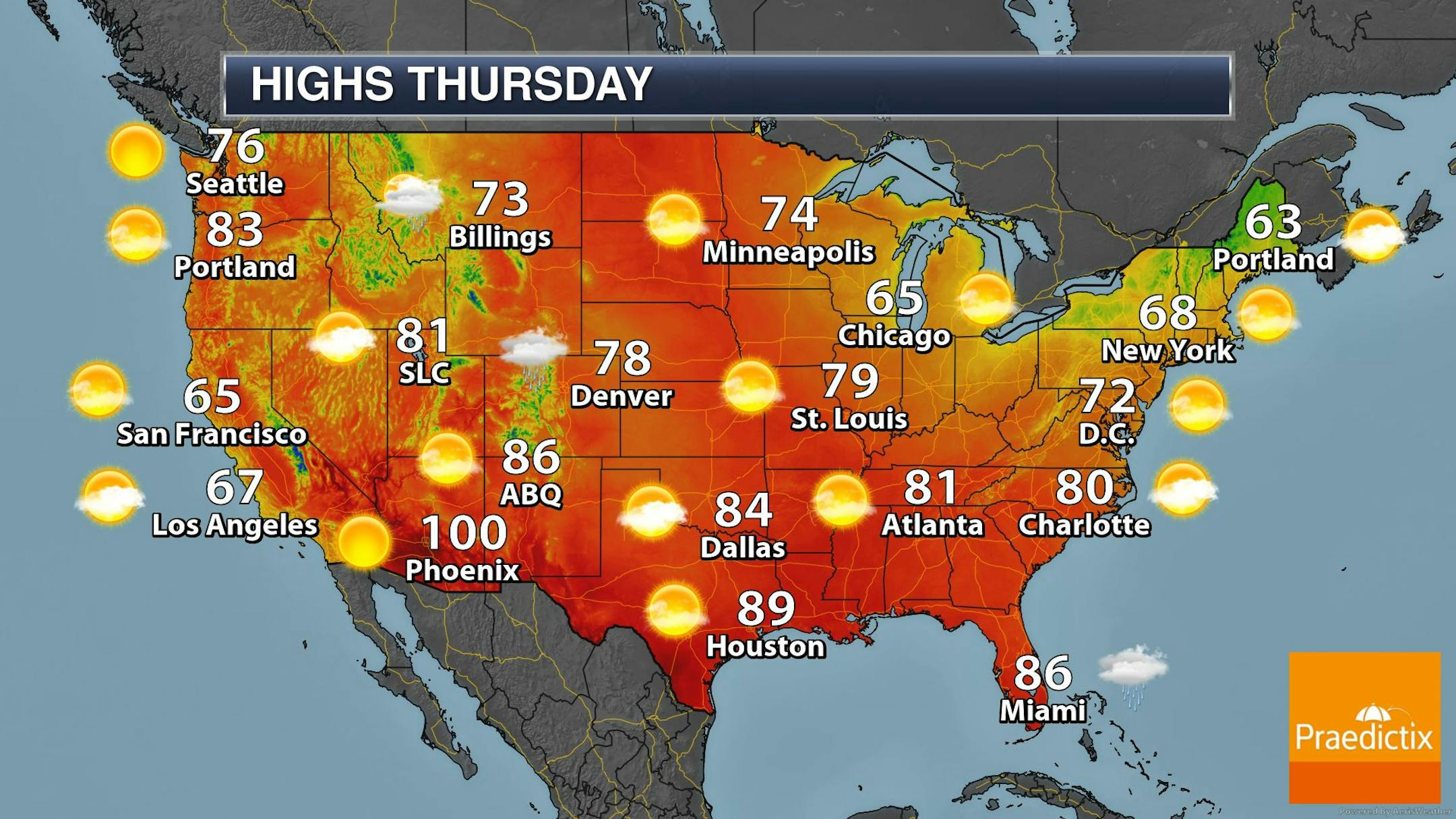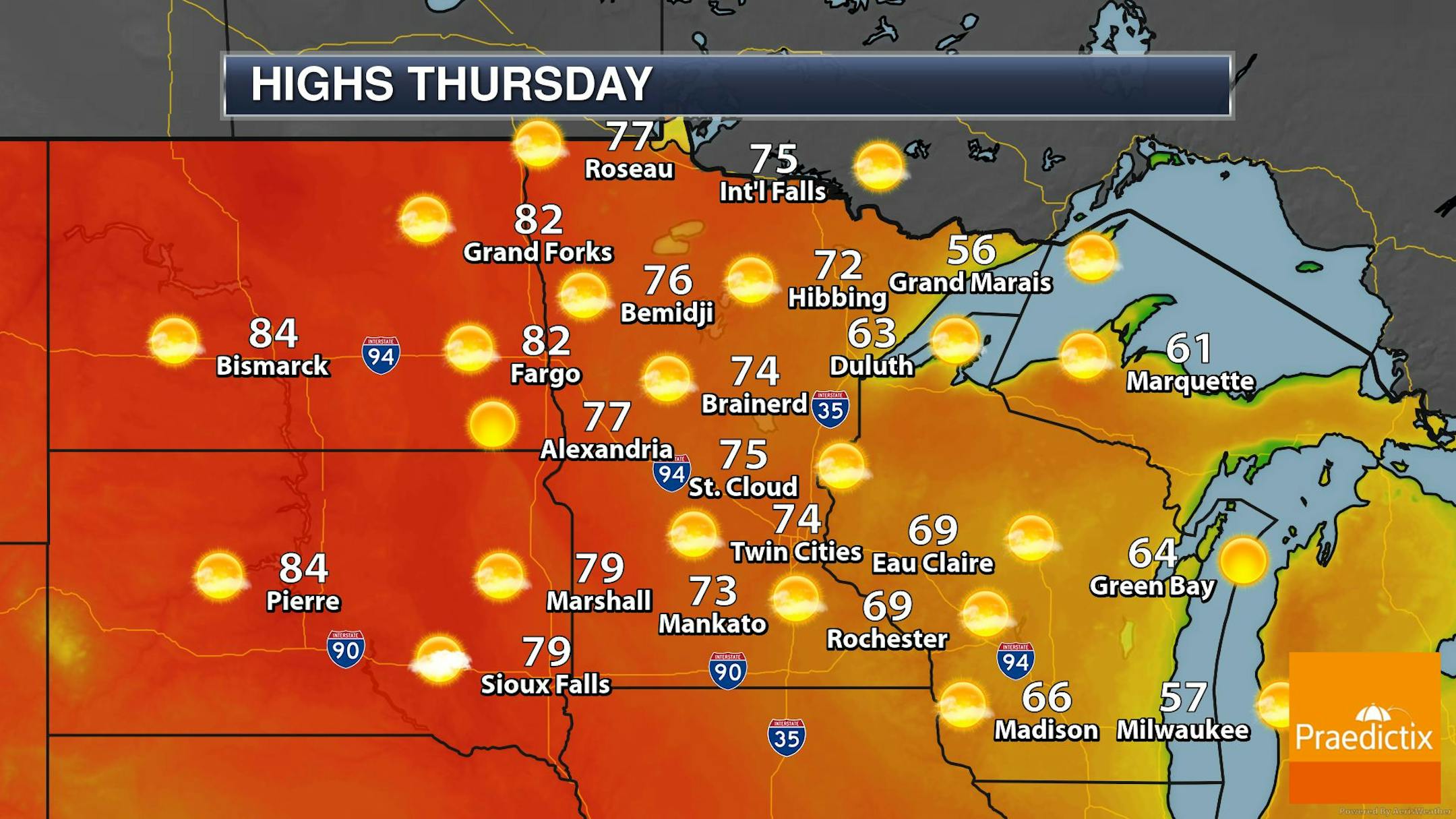 The weather outlook for the Twin Cities on Thursday, May 25th shows another sunny and mild day with highs warming into the mid 70s. Thanks to Canadian wildfires, skies will be fairly smoky/hazy with some air quality concerns across parts of the state