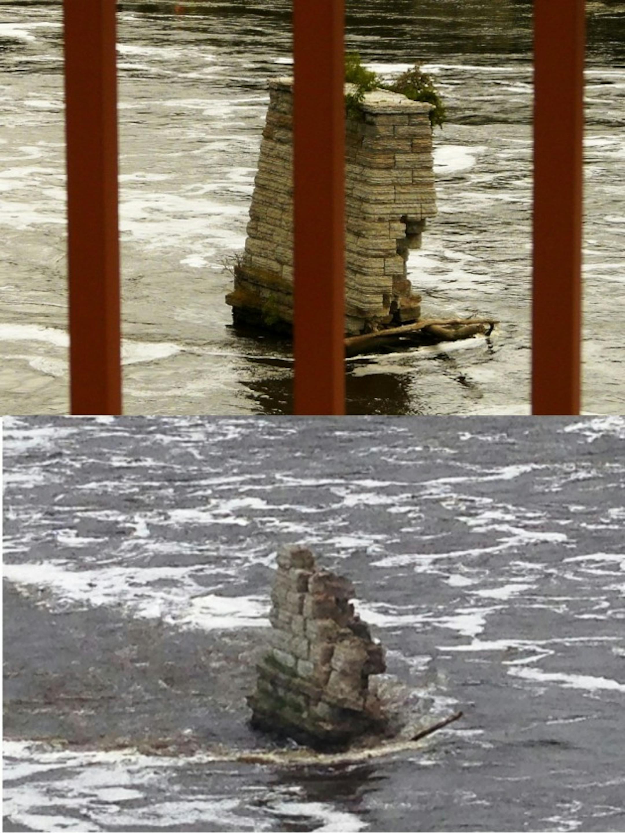 The pier that's long stuck out of the Mississippi River just downstream from the east end of the Stone Arch Bridge is now down to a nub of stone, presumably undercut by riverine erosion that's been eating at the pier base for several years, with this year's high flows contributing. One pier remains on the river's east bank.
