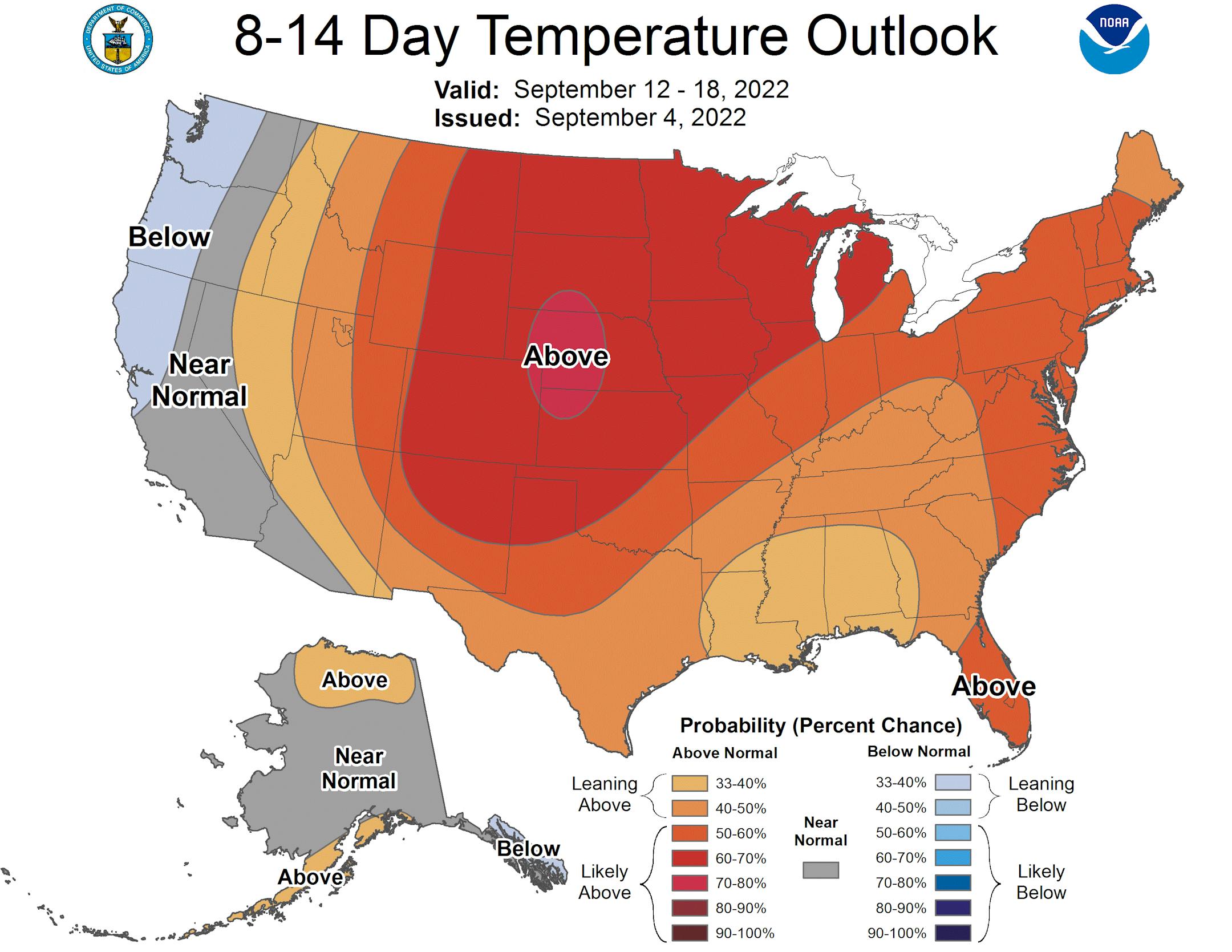 The extended temperature outlook for Minneapolis shows temps running above average by +5F to nearly +15F through the first full week of September. The warmest days will be Wednesday & Thursday with readings warming into the upper 80s to near 90F. Temps will be quite a bit cooler by Saturday after a frontal passage.