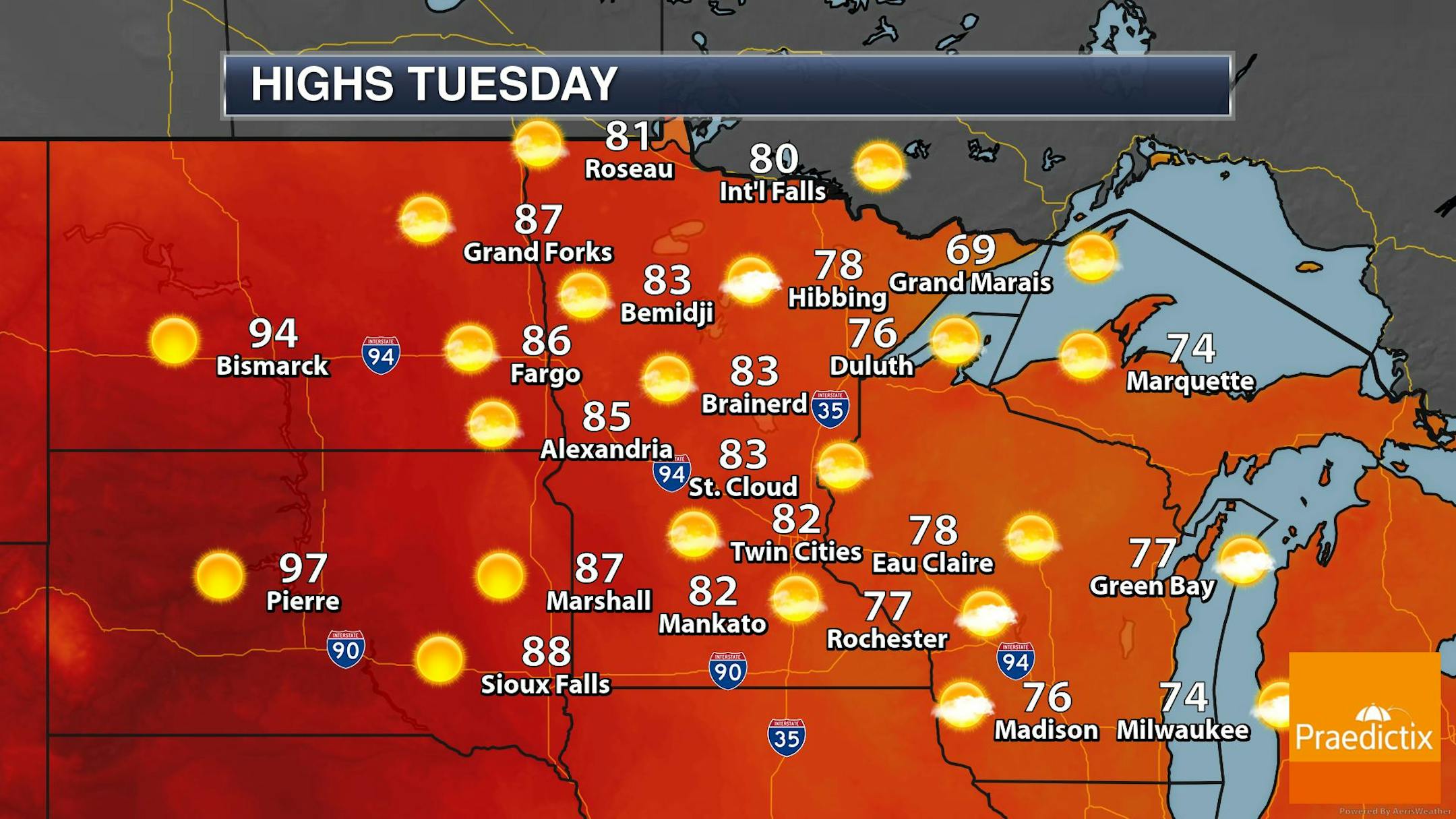 The weather outlook for Minneapolis on Tuesday shows temps warming into the lower 80s in the afternoon with mostly sunny skies.