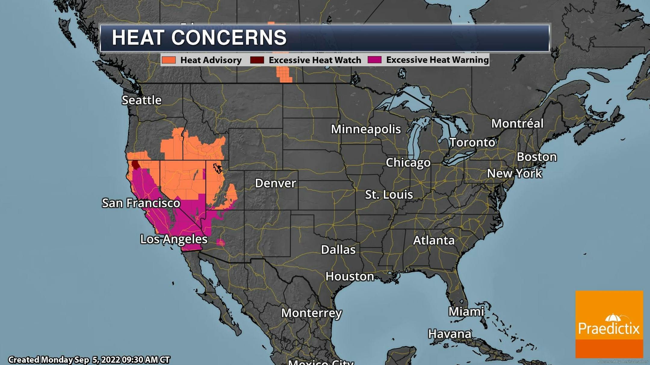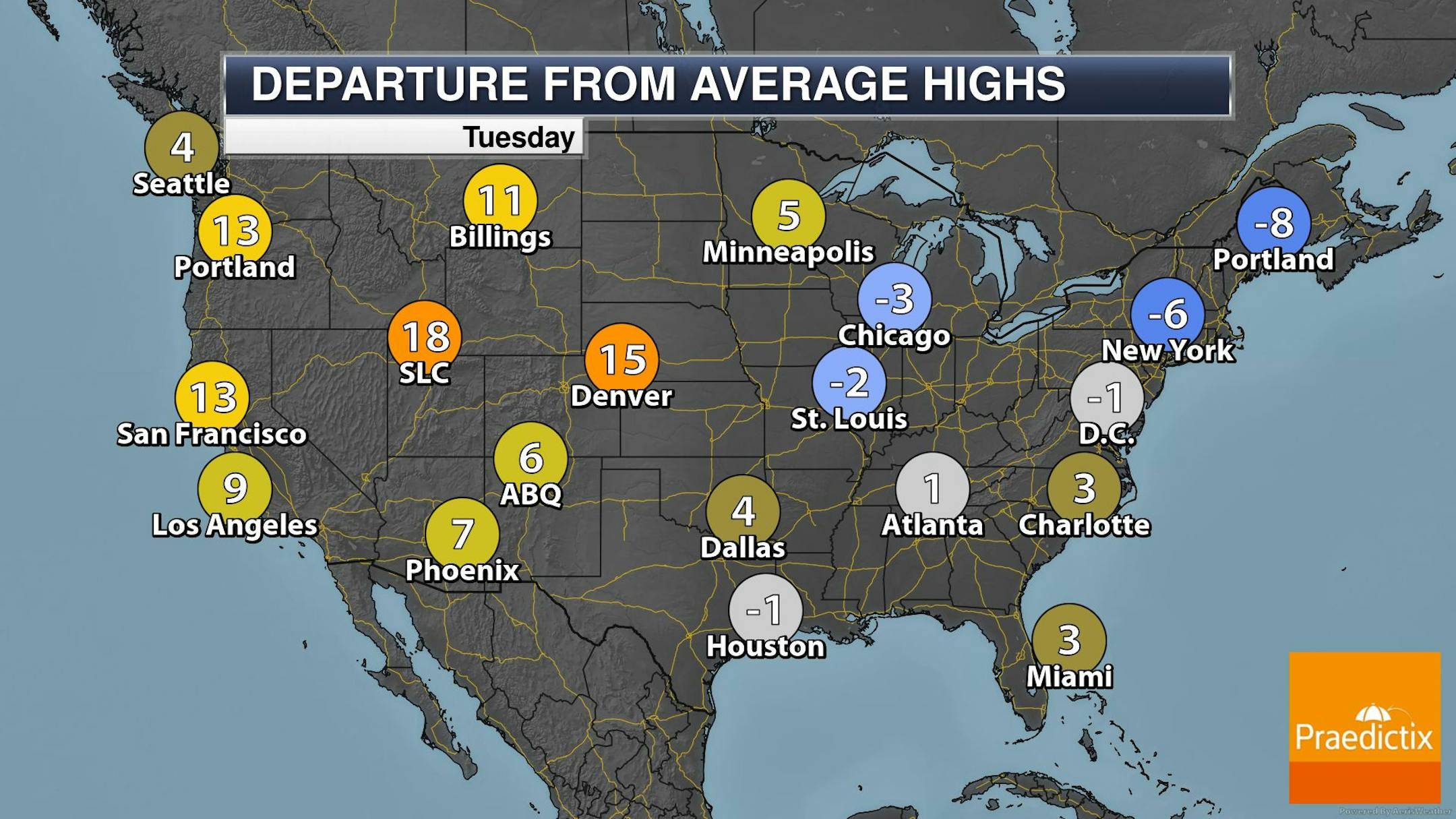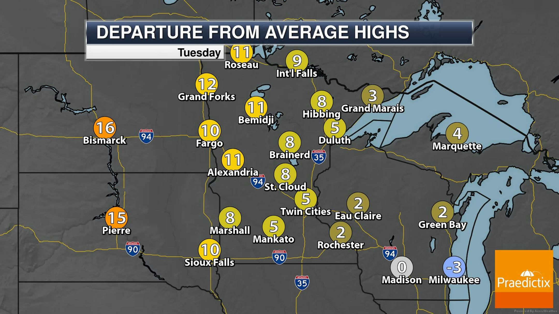 The weather outlook for Tuesday shows another dry and warm day with temps warming into the 70s and 80s, which will be nearly +5F to +10F above average. Temps in the Dakotas will warm into the 90s, which will be nearly +15F above average.
