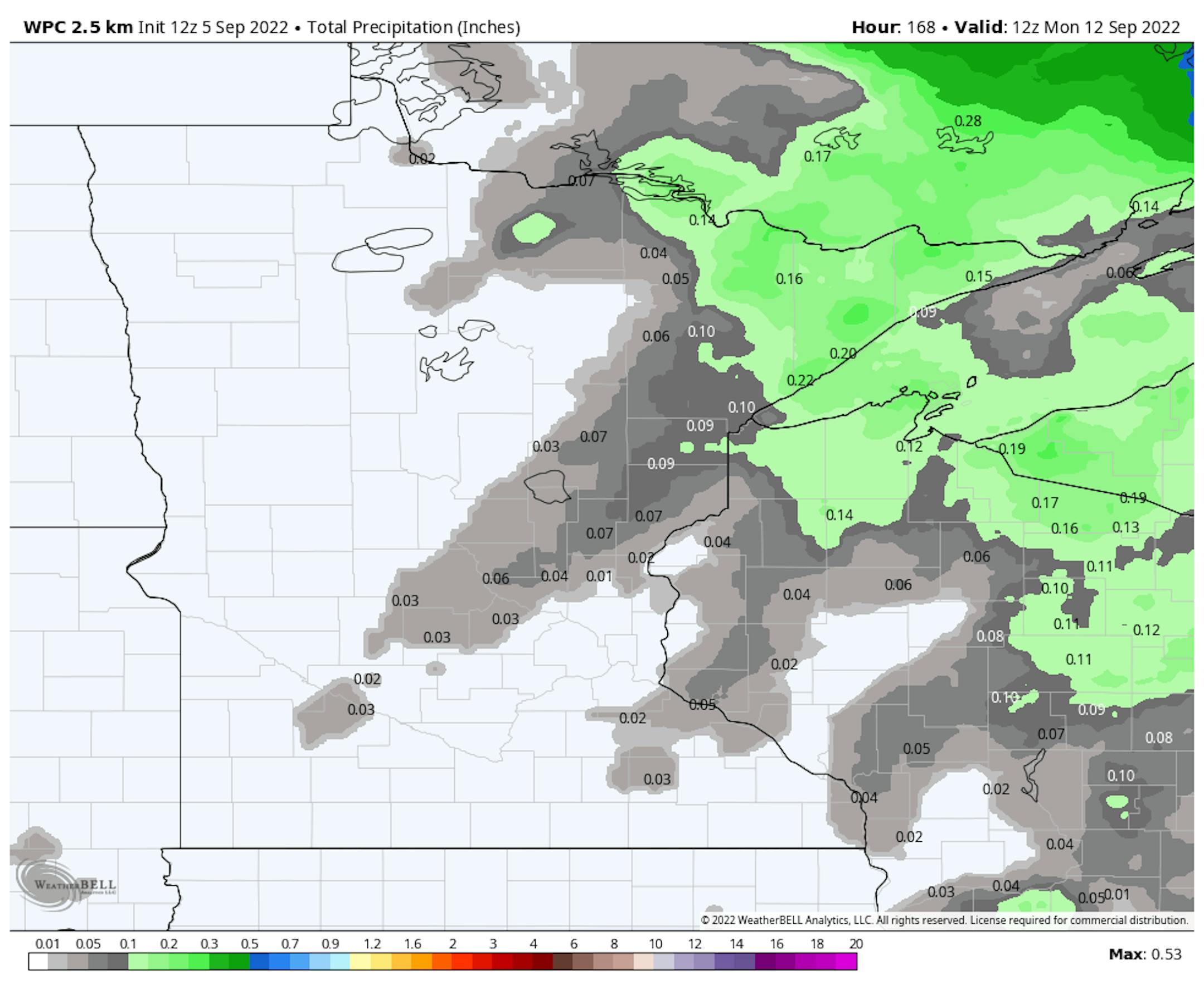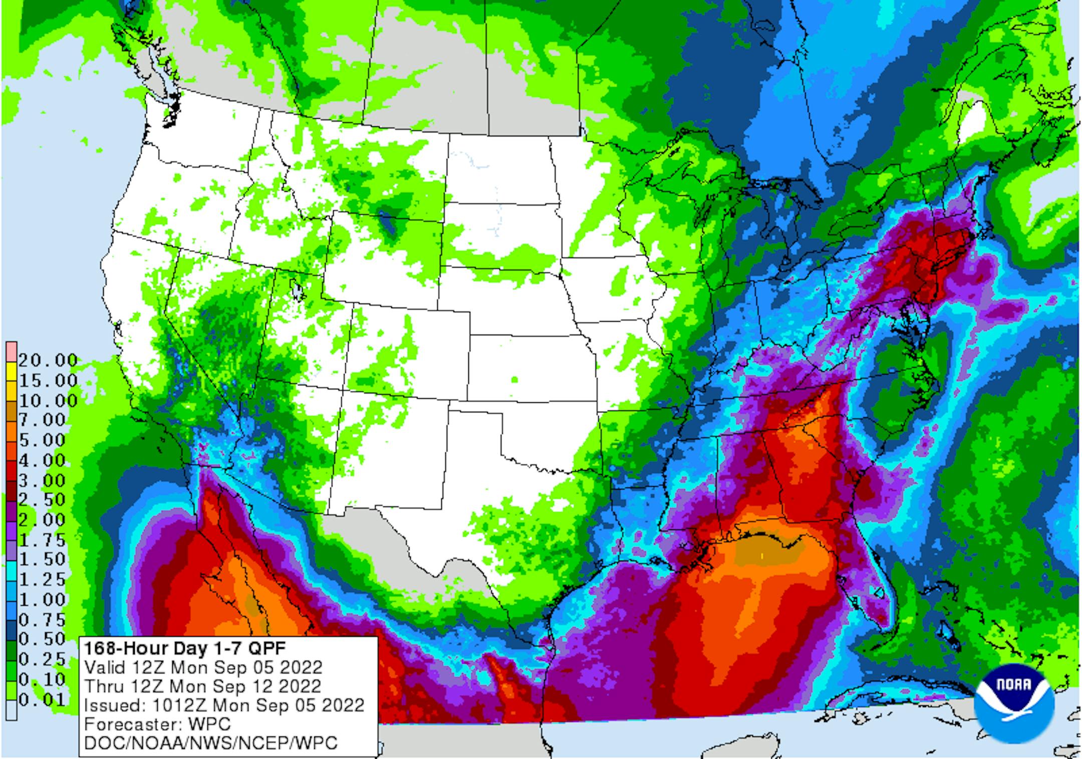 Weather conditions look exceptionally dry over the next several days, but later this week and weekend ahead could feature showers and storms. According to NOAA's WPC, there doesn't appear to be much rainfall potential.