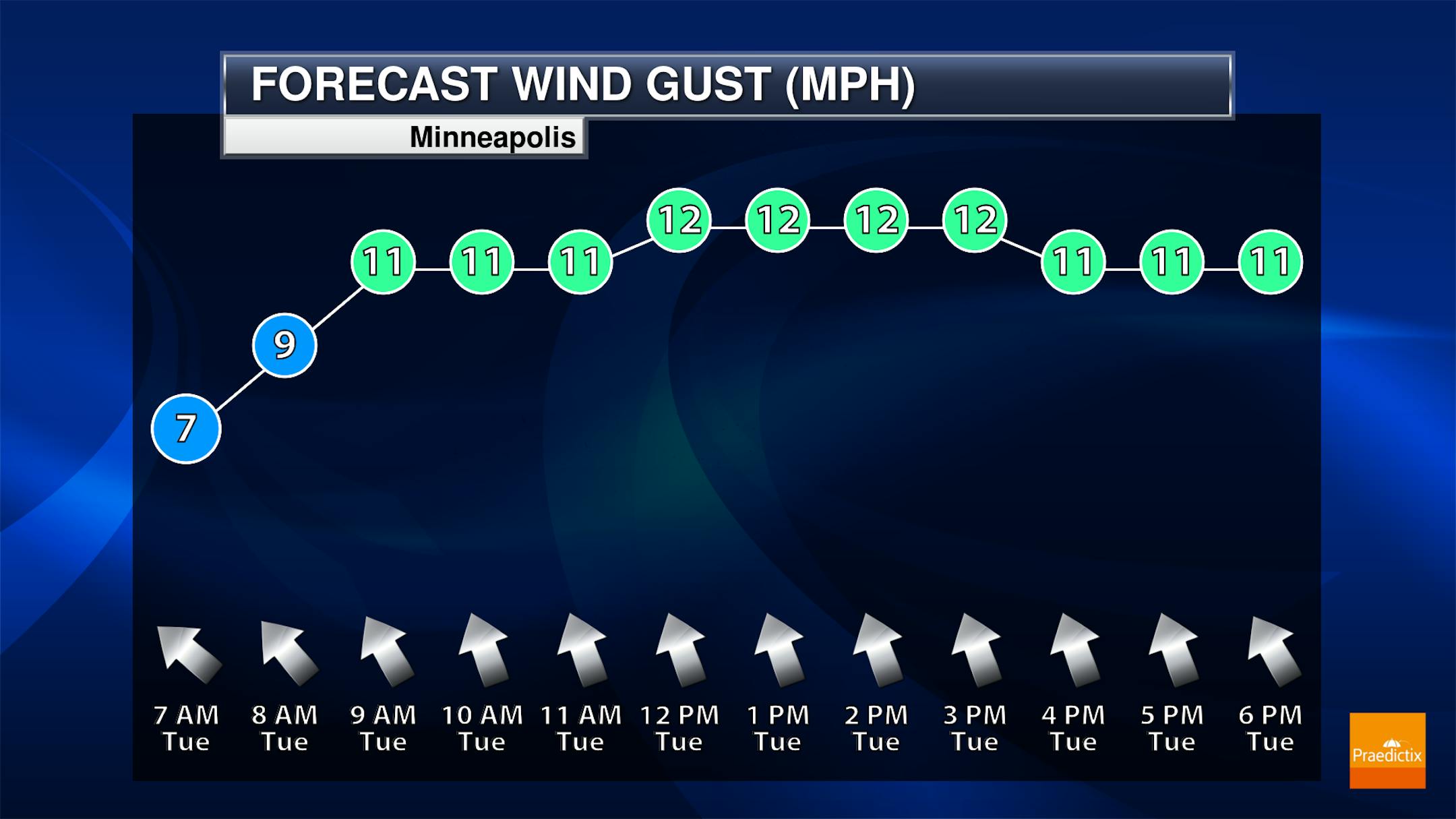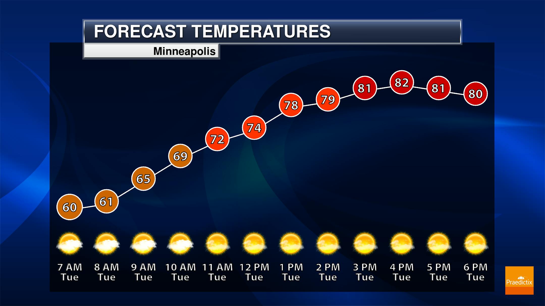 The hourly forecast for Minneapolis on Tuesday shows temperatures starting around 60F and warming into the lower 80s by the afternoon. It'll be another sunny day with southerly winds approaching 15mph at times.