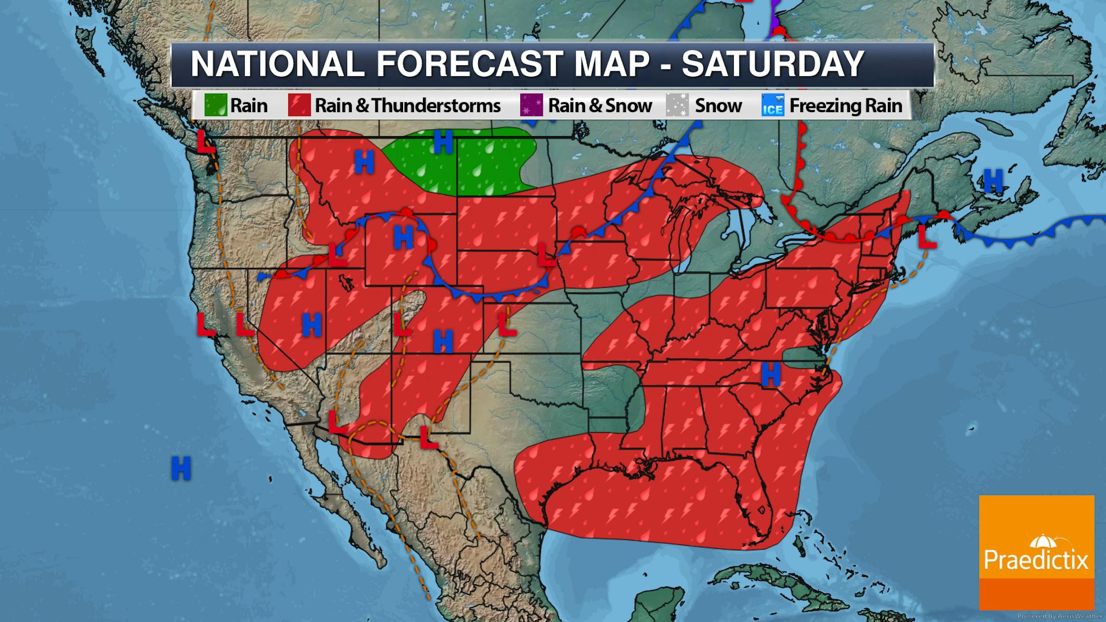 In the metro, we will watch rounds of rain, potentially accompanied by some thunder early in the day and then again in the later afternoon and evening hours. Morning temperatures will be warm in the 70s with highs climbing to the mid-80s before the cold front moves in.
