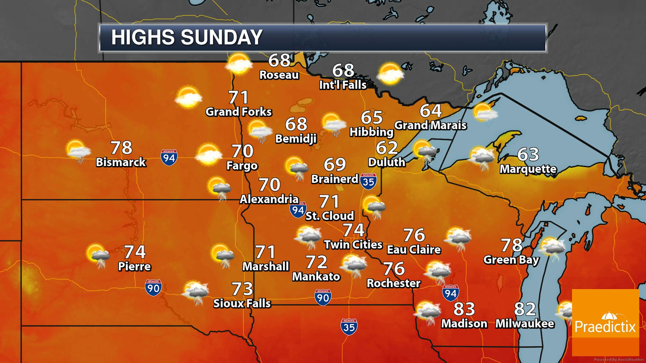 We will continue to watch more shower and thunderstorm chances on Sunday across southern Minnesota, particularly as we head toward the afternoon hours. 60s and 70s are expected for highs across the state.