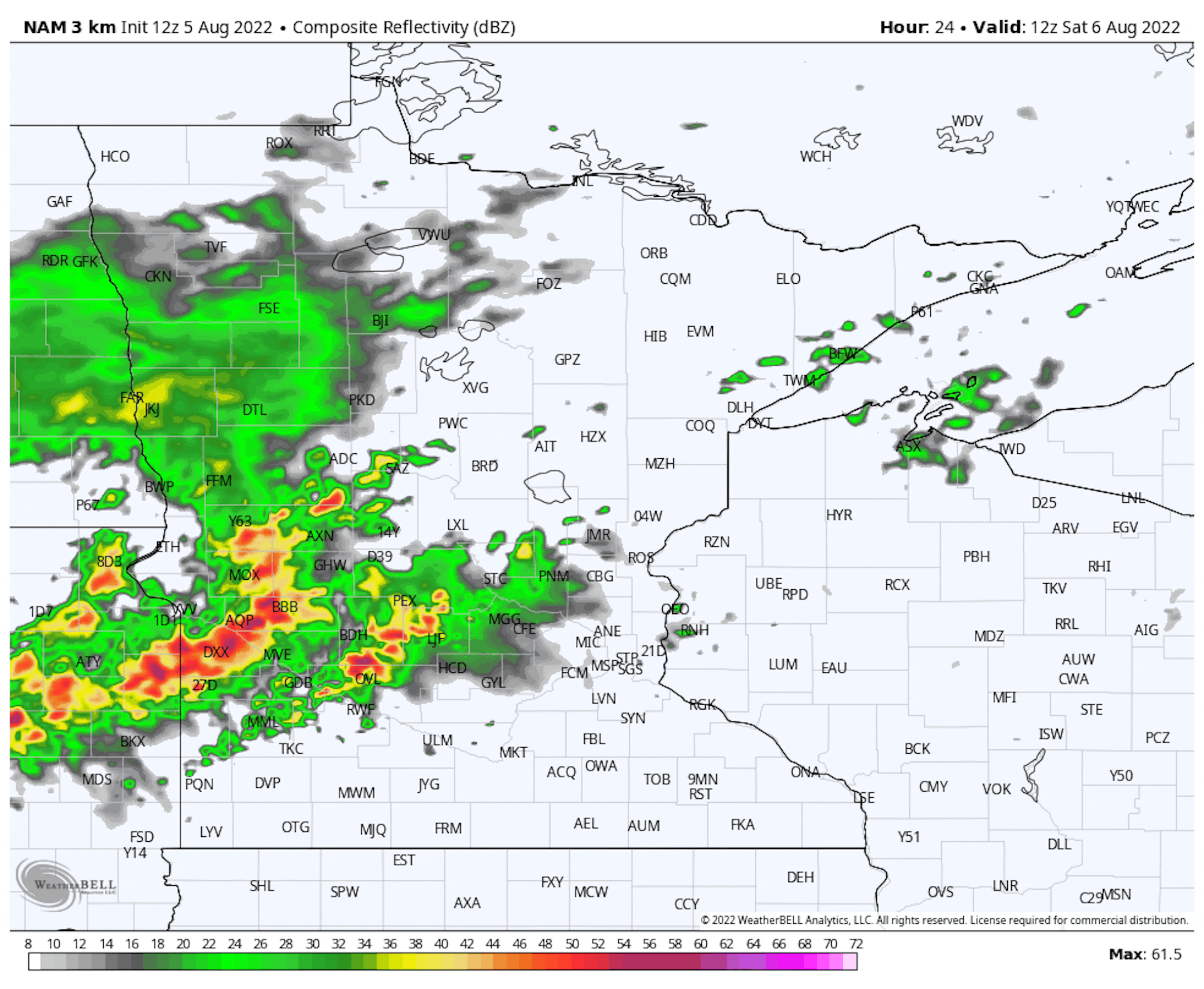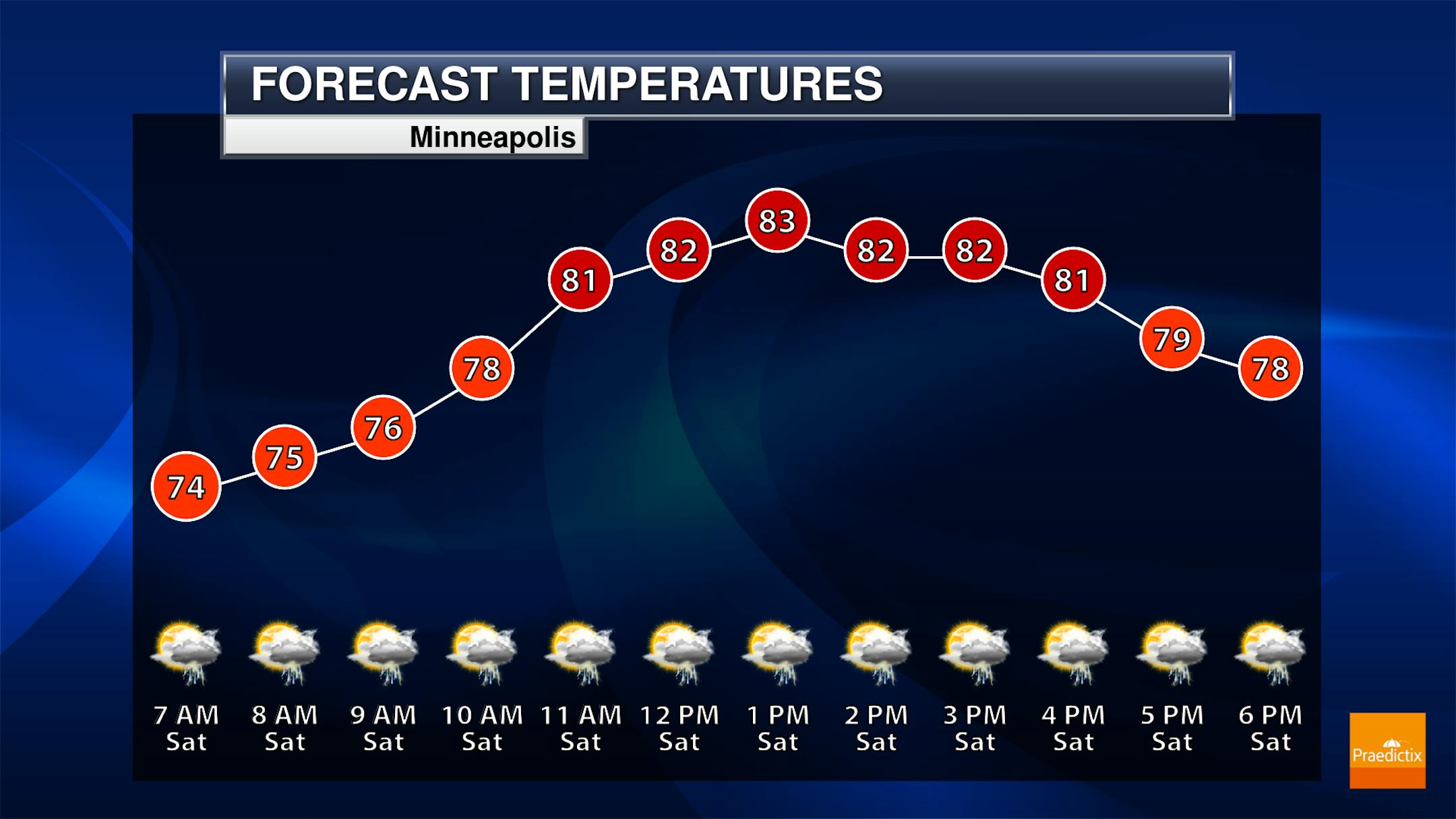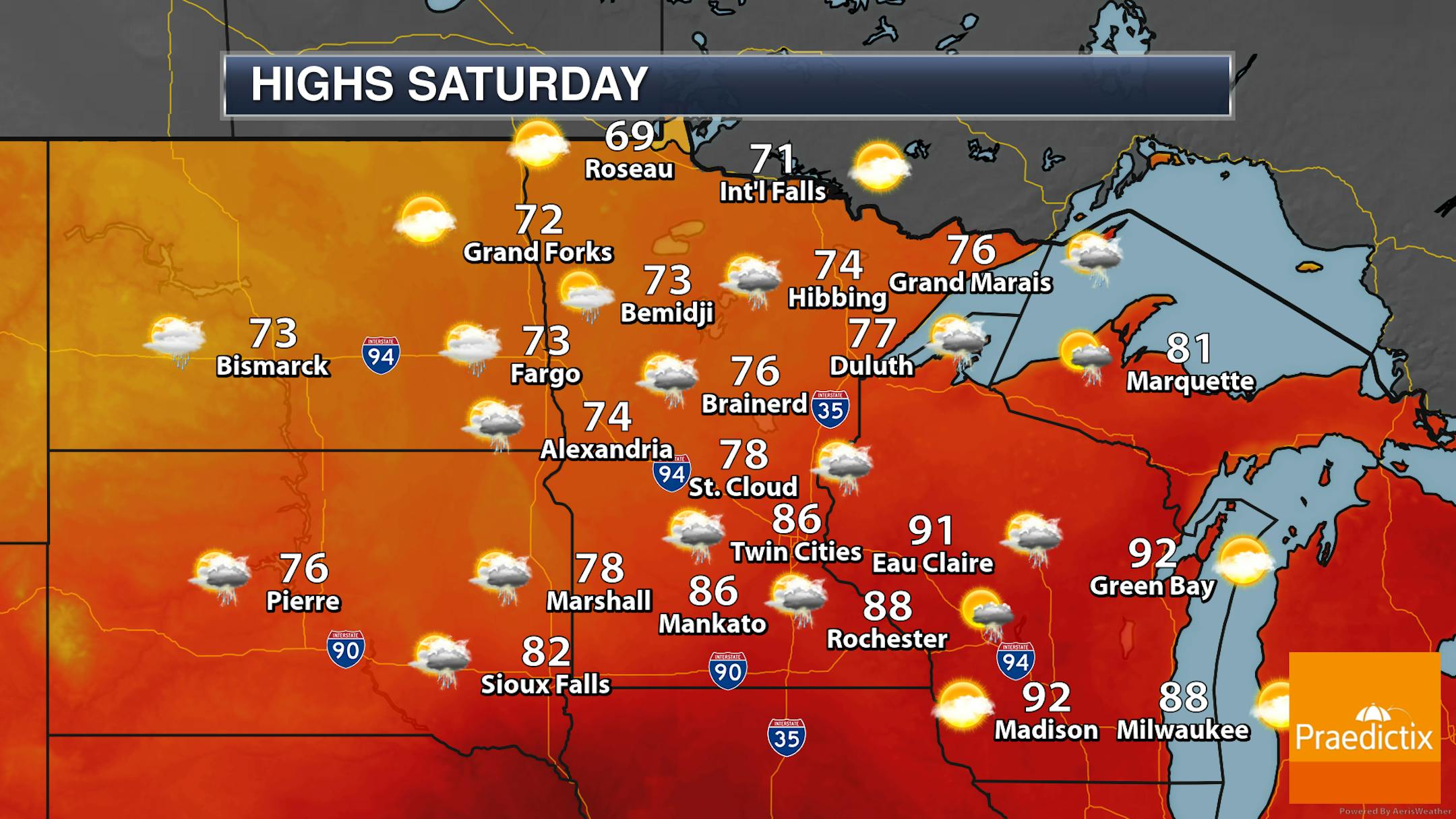 We will continue to watch those rain chances across the state on Saturday - more in the form of showers across northern Minnesota with a few thunderstorms the farther you head south. Highs will range from the 60s in northwestern Minnesota to the 80s in southern Minnesota.