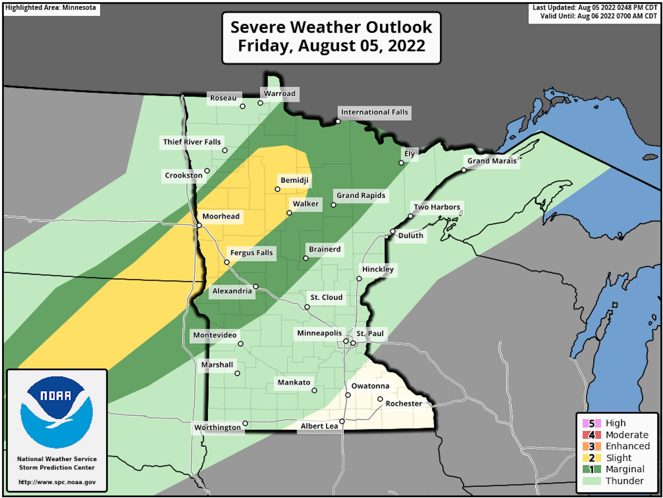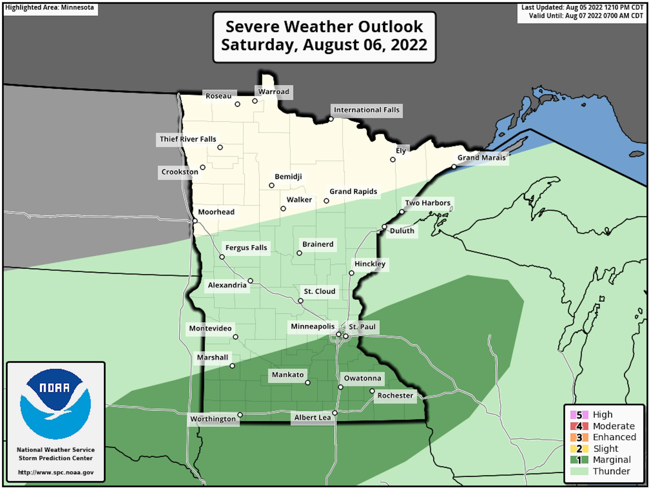 As a cold front moves across the state on Saturday we will watch the potential of showers and thunderstorms. Some of them later in the day into the evening/overnight could be strong to severe with a Marginal Risk (threat level 1 of 5) in place across southern Minnesota including parts of the metro. Hail and wind are the greatest threats (along with heavy rain).