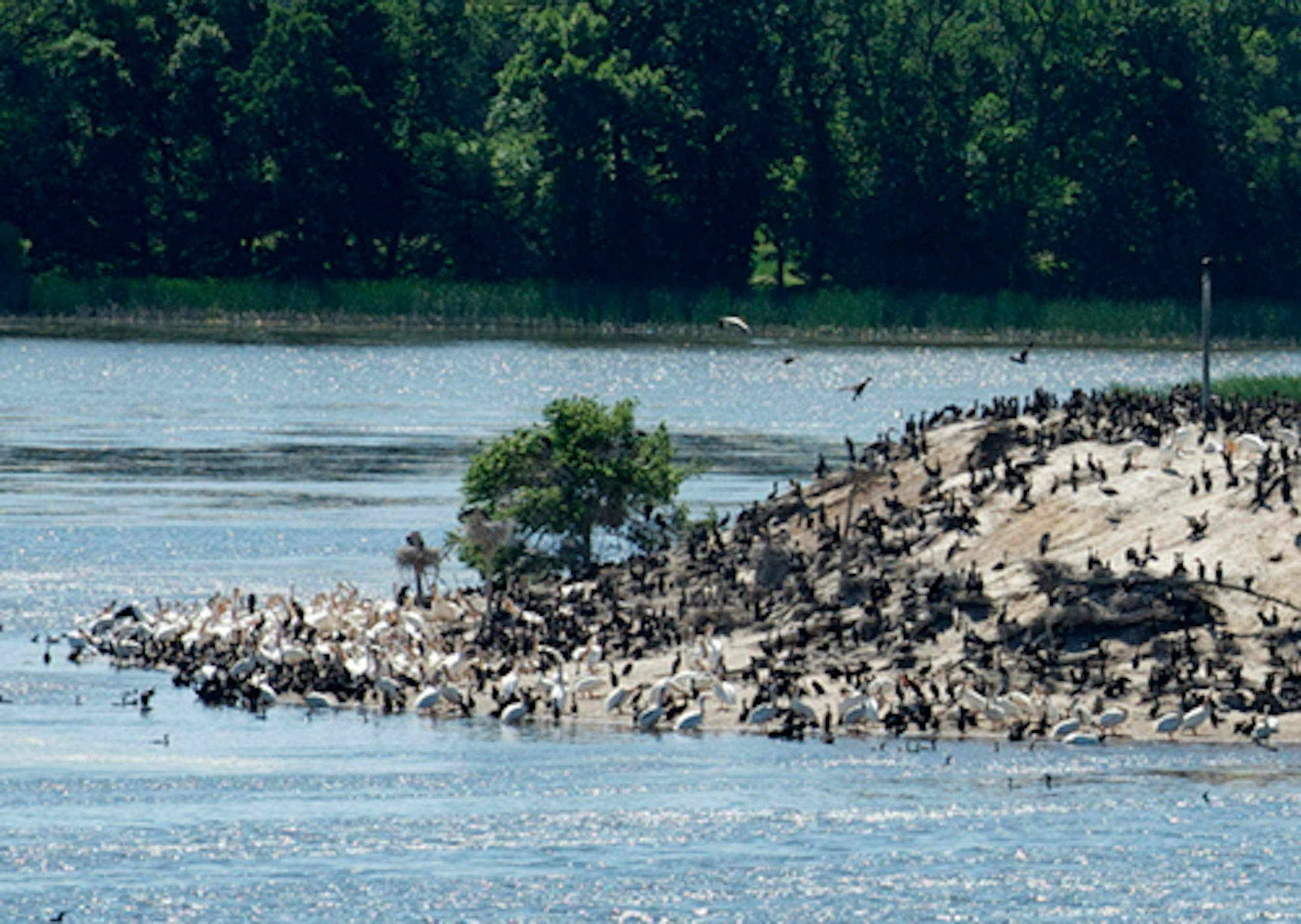 If you are looking for a short weekend birding trip well worth the drive, this is it. Take Highway 12 west to Dassel. Go south on Highway 15 for about three miles (more or less; we didn't measure).Here you will find Pigeon Lake and an island in its middle that is home to thousands of waterbirds that nest in colonies or hang around in large groups: Double-crested Cormorants, American White Pelicans, Great Blue Herons, American Egrets for certain, maybe other species if you take a scope and give it a good look. There is a parking area overlooking the lake. The view is perfect. I learned of this yesterday in an email from friend Mark Martell, who works for Audubon Minnesota. Pigeon Lake and its island have been designated as one of Minnesota's Important Bird Areas, a label indicating need for protection and conservation. It's the most spectacular birding site within several hours drive in any direction from the Twin Cities. On the way, along Highway 12, watch for wetlands where Black Terns are breeding. We saw at least a dozen of these birds as we drove through. The photo shows about one-third of the island in Pigeon Lake.
