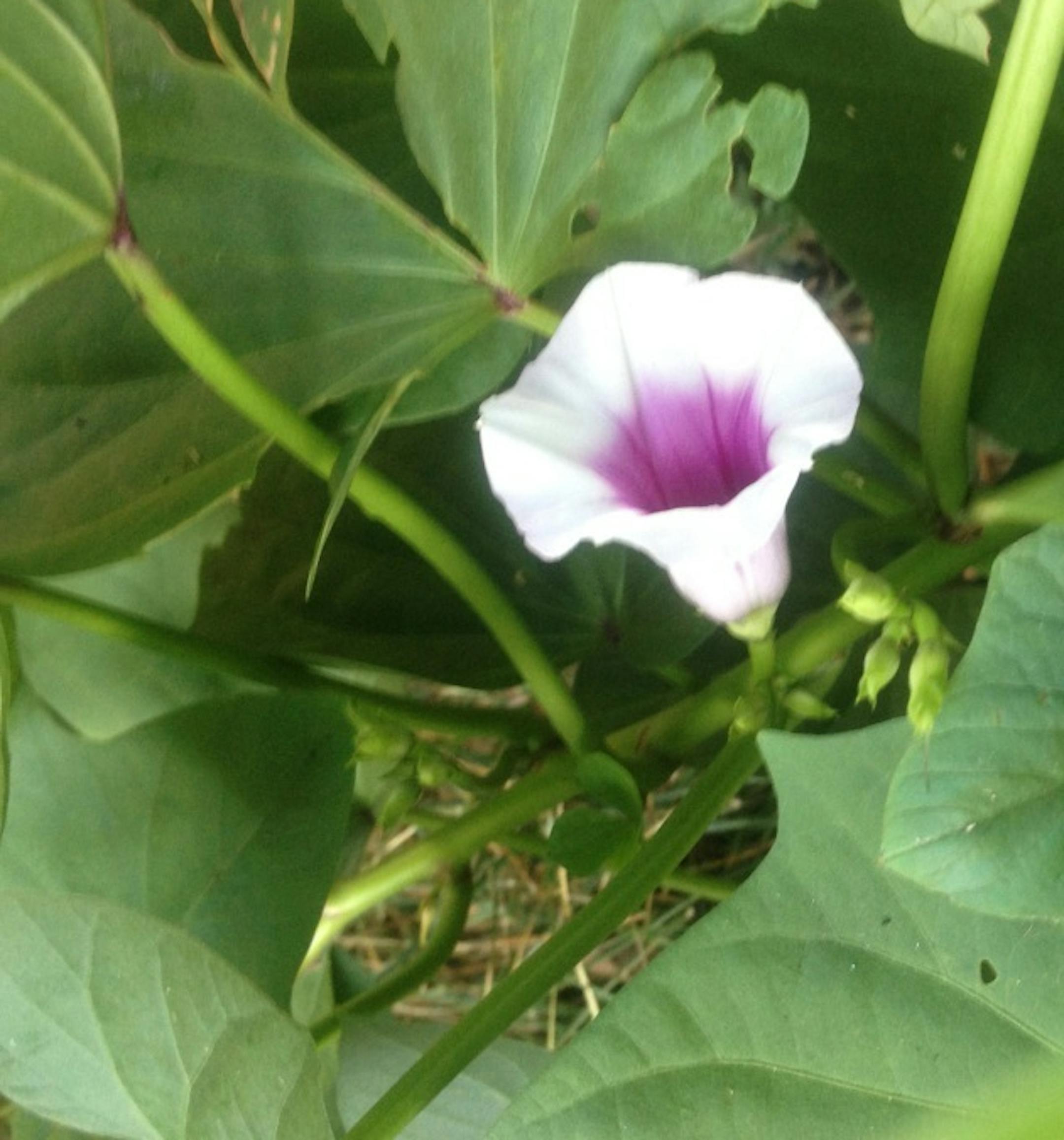 I was excited when they began flowering early this month. The quarter-sized flowers were lavender with a darker throat, just like the flowers on my ornamental sweet potato vine. Some Master Gardeners told me flowering meant that it was time to harvest, while others said to wait until the vines begin to yellow. That started a couple of weeks ago.
