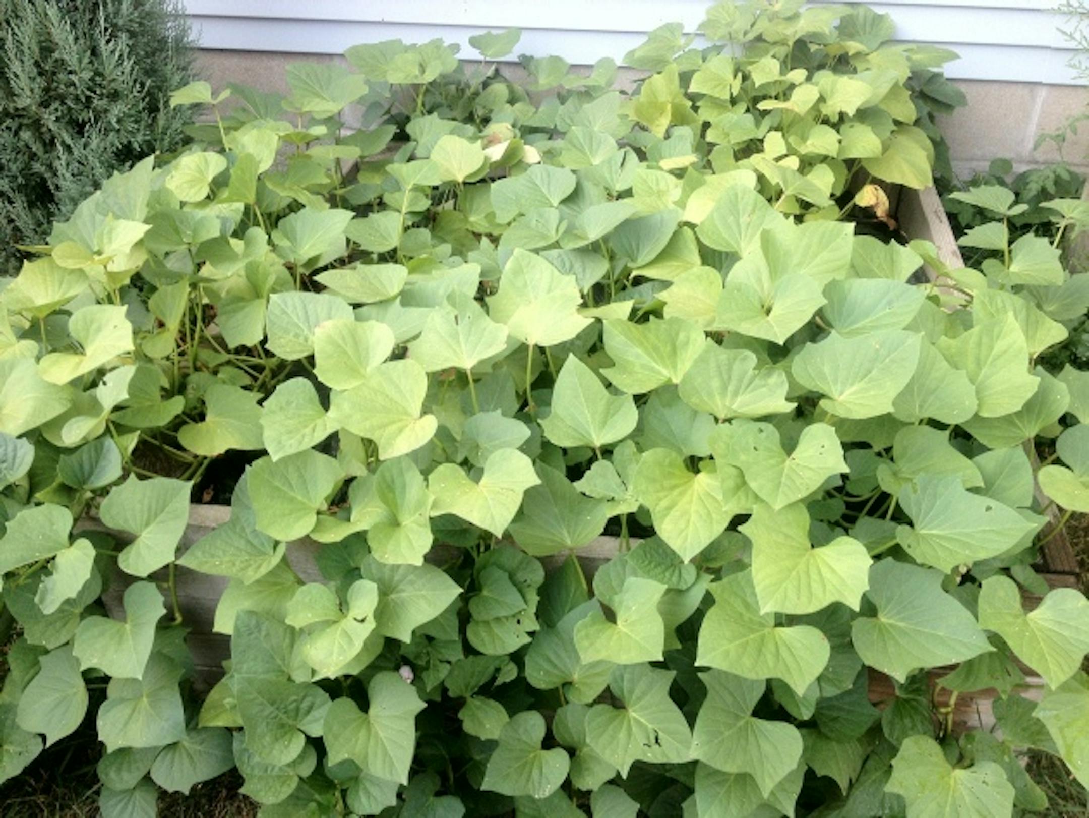 They were my big garden experiment this year. Last winter, I ordered "Georgia Jet" slips — the little sprouts that you plant — from a company in Tennessee. When they arrived late in May, they were looked pathetic, but I planted them in my raised bed with high hopes.